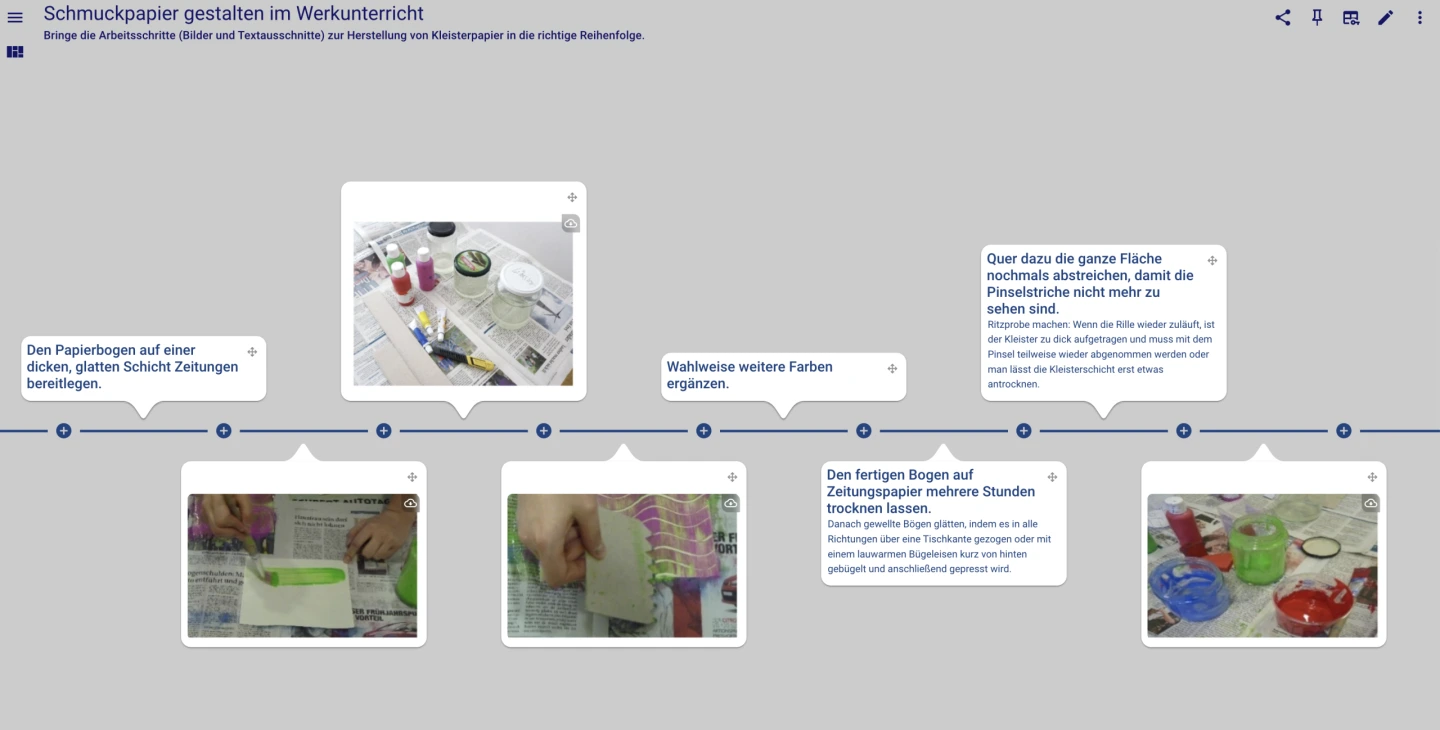 Die Lernenden können kooperativ oder in Einzelarbeit an digitalen grafischen Strukturierungsformen arbeiten. Diese unterstützen in Form von Mindmaps, Concept Maps, Zeitleisten oder Tabellen das Verständnis.