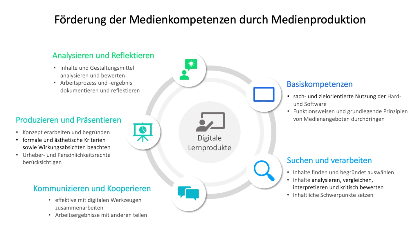 Die Förderung der Medienkompetenz der Lernenden erfolgt nicht isoliert, sondern immer eingebettet in einen ganzheitlichen pädagogischen Kontext. Dabei werden stets auch andere Fähigkeiten und Fertigkeiten der Kinder und Jugendlichen angesprochen und weiterentwickelt. Durch die gezielte Anleitung bei der Konzeption und Erstellung digitaler Lernprodukte erwerben die Lernenden nicht nur Bedienkompetenzen, sondern festigen und erweitern zugleich ihr Wissen und ihre Fähigkeiten in den Bereichen „Suchen und Verarbeiten“, „Kommunizieren und Kooperieren“, „Produzieren und Präsentieren“ sowie „Analysieren und Reflektieren“. Somit kann jedes Unterrichtsfach aus seiner jeweiligen Fachperspektive einen wertvollen Beitrag zur Entwicklung der Medienkompetenz der Schülerinnen und Schüler leisten.