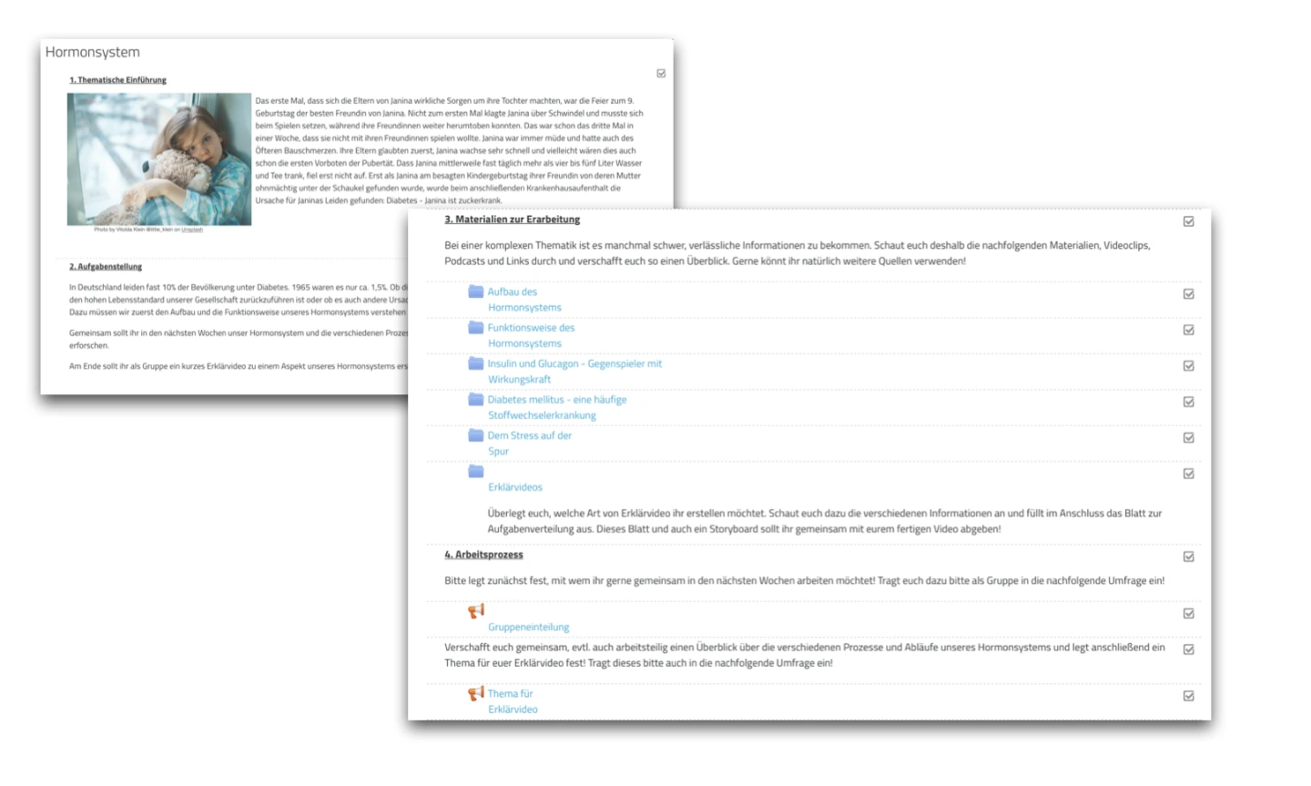 Damit Lernende bei der Erstellung von Lernprodukten gezielt unterstützt werden, ist es ggf. sinnvoll, den Prozess in einzelne Arbeitsschritte zu gliedern und entsprechend anzuleiten. Diese Strukturierung kann technisch über eine digitale Lernumgebung erfolgen, die den Lernenden Orientierung bietet und die Einreichung von Zwischenergebnissen ermöglicht.