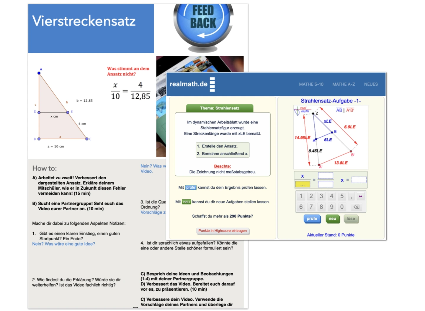 Um in einem Erklärvideo einen häufigen Fehler verständlich darzustellen oder die fachliche Richtigkeit von Erklärungen der Mitschülerinnen und Mitschüler beurteilen zu können, müssen die Lernenden den Vierstreckensatz zunächst sicher anwenden. Der gezielte Einsatz von Online-Übungseinheiten in der Aufgabenstellung eignet sich dabei besonders, um das eigene Wissen selbstständig zu überprüfen. -