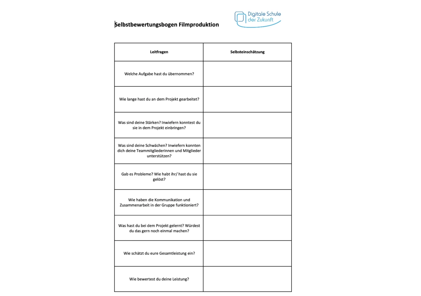 Des Weiteren kann ein Selbstreflexionsbogen eingesetzt werden, bei dem die Lernenden ihre eigene Leistung einschätzen und begründen. Für die persönliche Entwicklung der Heranwachsenden ist es wertvoll, eigene Stärken und Schwächen benennen zu können und Verantwortung für das eigene Lernprodukt zu übernehmen. Falls Selbsteinschätzung und Bewertung der Lehrkraft sehr weit auseinander gehen, kann dies auch Anlass für ein pädagogisches Gespräch sein, in dem man auf Basis der vorgegebenen Kriterien die Ergebnisse gemeinsam nachbespricht.