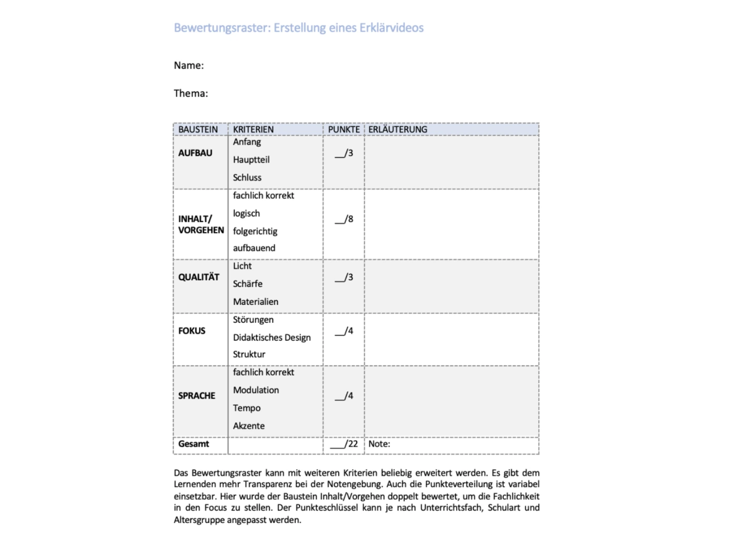 Ein Bewertungsraster dient als Grundlage für das Feedback an die Lernenden, das auch Grundlage für Leistungserhebungen sein kann. Dabei werden die unterschiedlichen Ebenen der Bewertung wie Inhalt, kreative Umsetzung und formale Korrektheit transparent gemacht. Ob diese einzeln bepunktet werden oder eine inhaltliche, schriftliche Rückmeldung dazu erfolgt, obliegt der Lehrkraft. -