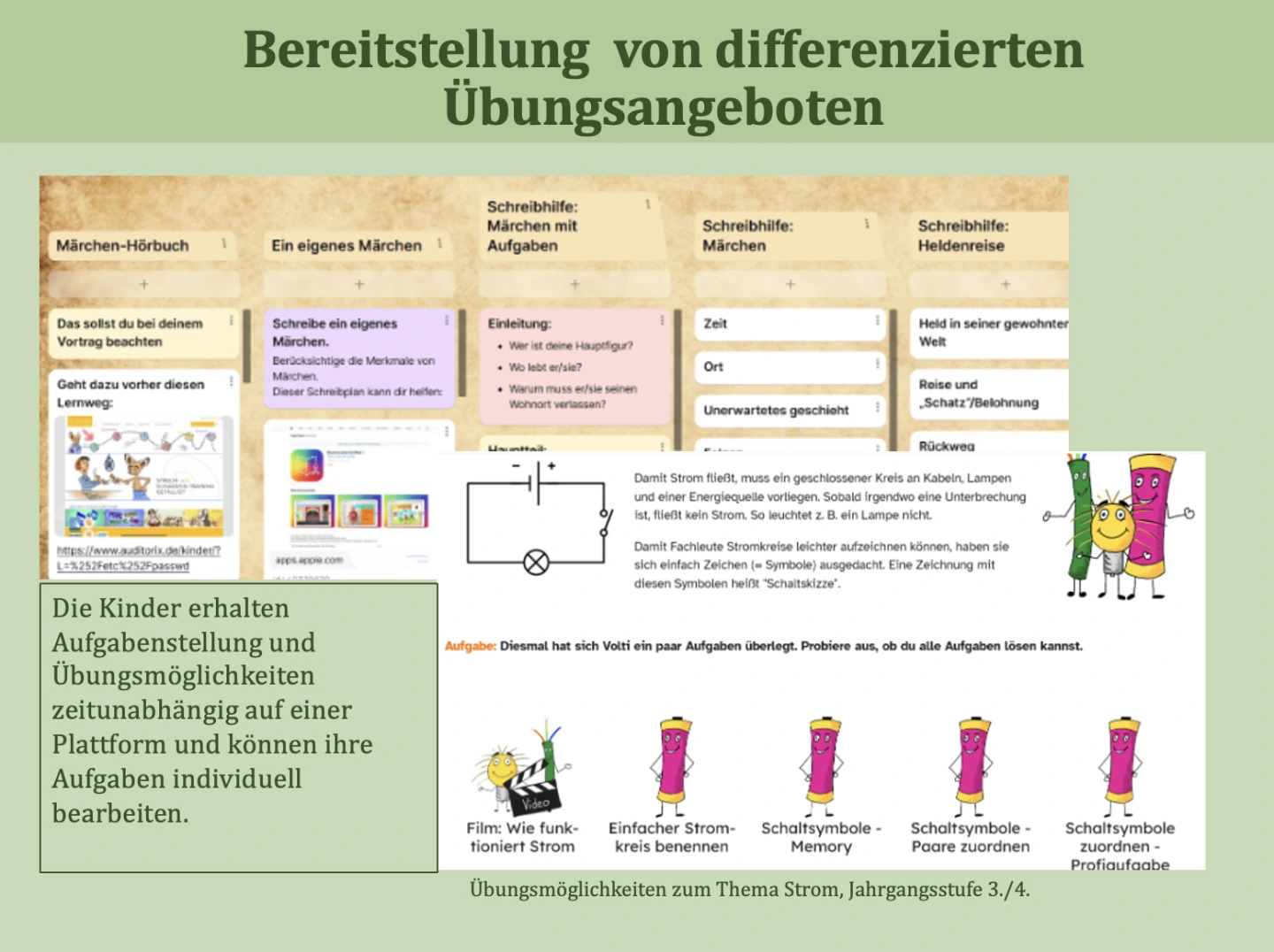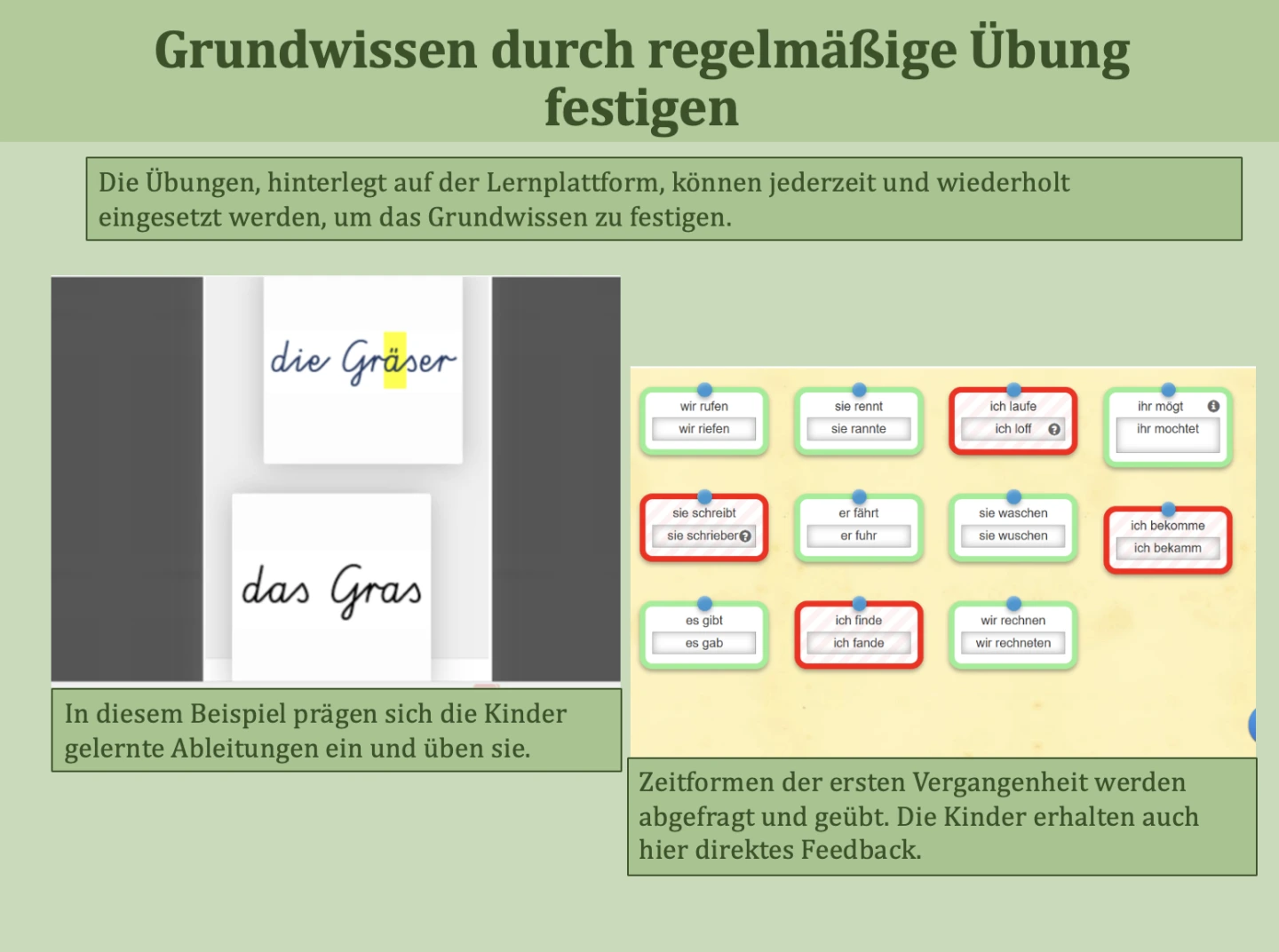 Digitale Plattformen ermöglichen es, Übungsangebote differenziert bereitzustellen. Schülerinnen und Schüler arbeiten im Unterricht oder in angeleiteten Phasen auf ihrem individuellen Niveau. Aufgaben können mehrfach bearbeitet werden und bieten oft direkte Rückmeldungen, die das Lernen unterstützen. Lehrkräfte wählen gezielt passende Übungen aus, um Lernstände aufzugreifen und Kinder individuell zu fördern.