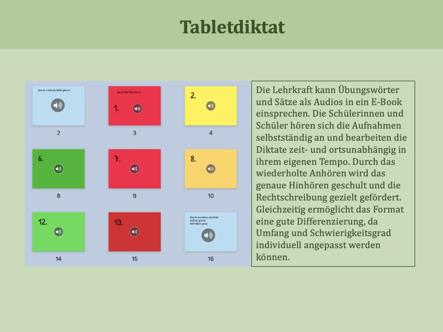 Bereitstellung eines Tabletdiktats zu Übungswörtern und –sätzen im E-Book -
