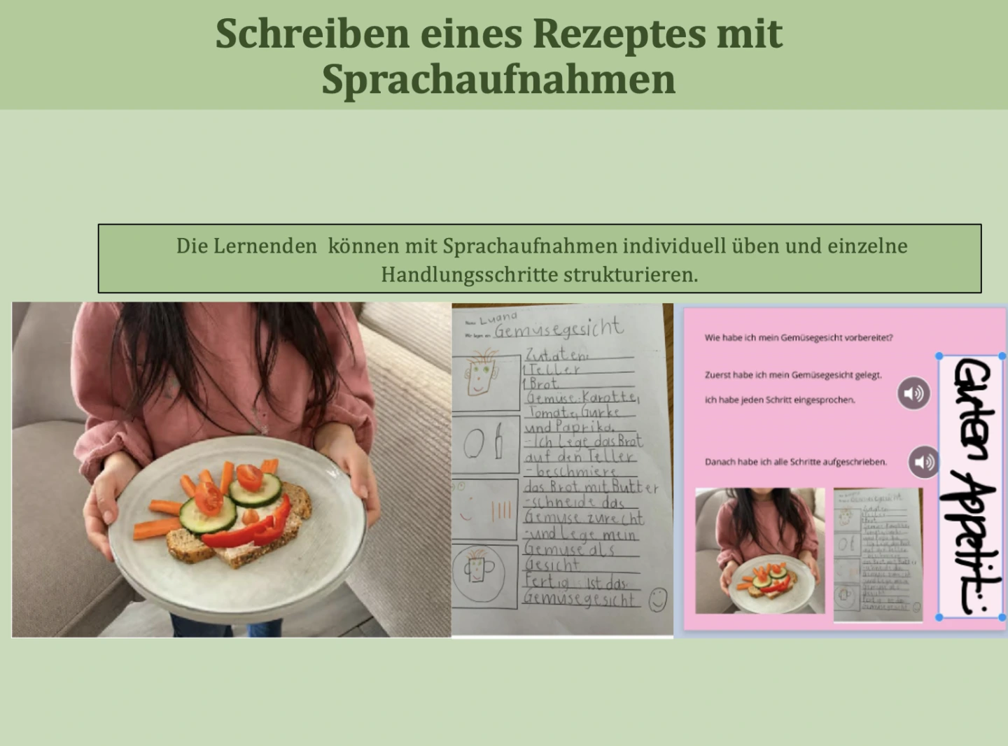 Das Kind legte zunächst ein eigenes Gemüsegesicht und bereitete dieses zu. Anschließend wurden die einzelnen Handlungsschritte mithilfe eines Tablets fotografisch dokumentiert, in ein digitales Rezeptbuch integriert und eingesprochen. Im weiteren Verlauf verschriftlichte das Kind die Handlungsschritte zusätzlich. Dies ist bedeutsam, da die Kinder ihre eigenen Handlungsprozesse bewusst reflektieren, sprachlich strukturieren und nachhaltig sichern können. Zugleich werden Selbstständigkeit, Ausdrucksfähigkeit sowie Medienkompetenz gefördert.