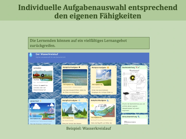 Beispiel HSU Jgst 4.: Die Kinder greifen auf verschiedene Aufgaben zurück. Die individuelle Aufgabenauswahl ermöglicht es Schülerinnen und Schülern, auf ihrem eigenen Niveau zu lernen und dabei passend gefördert und gefordert zu werden. Beim Lesen können Kinder zwischen leichteren und anspruchsvolleren Texten wählen oder sich Texte vorlesen lassen. In Mathematik arbeiten sie zum gleichen Thema auf unterschiedlichen Niveaus, etwa mit einfachen Rechenaufgaben, Sachaufgaben oder kleinen Knobelaufgaben. Digitale Übungen bieten dabei oft passende Schwierigkeitsstufen oder passen sich automatisch an. Im Sachunterricht können Schülerinnen und Schüler wählen, wie sie Inhalte erarbeiten, zum Beispiel über einen Text, ein Video oder Bilder, und wie sie ihre Ergebnisse zeigen, etwa durch ein Plakat, eine Sprachaufnahme oder ein kurzes Video.