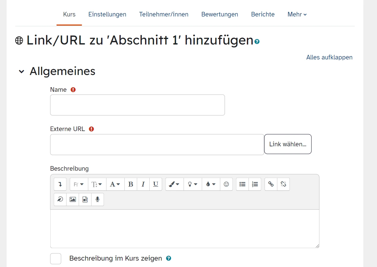 Das Arbeitsmaterial „Link/URL“ bietet Ihnen unterschiedliche Einstellungsmöglichkeiten, die sich für verschiedene didaktische Szenarien eignen. Links können beispielsweise unkommentiert auf eine externe Seite verweisen, auf welche die bzw. der Lernende direkt weitergeleitet wird. Es können aber auch Links mit Beschreibungen versehen werden, die sich in einem Pop-up-Fenster öffnen. So bleiben Lernende im Kurs und können sich leicht Zusatzinformationen ansehen. Über die Funktion „Einbetten” lassen sich Inhalte externer Webseiten direkt in den Kurs einbinden. Diese Funktion muss jedoch von der gewünschten Webseite unterstützt werden.