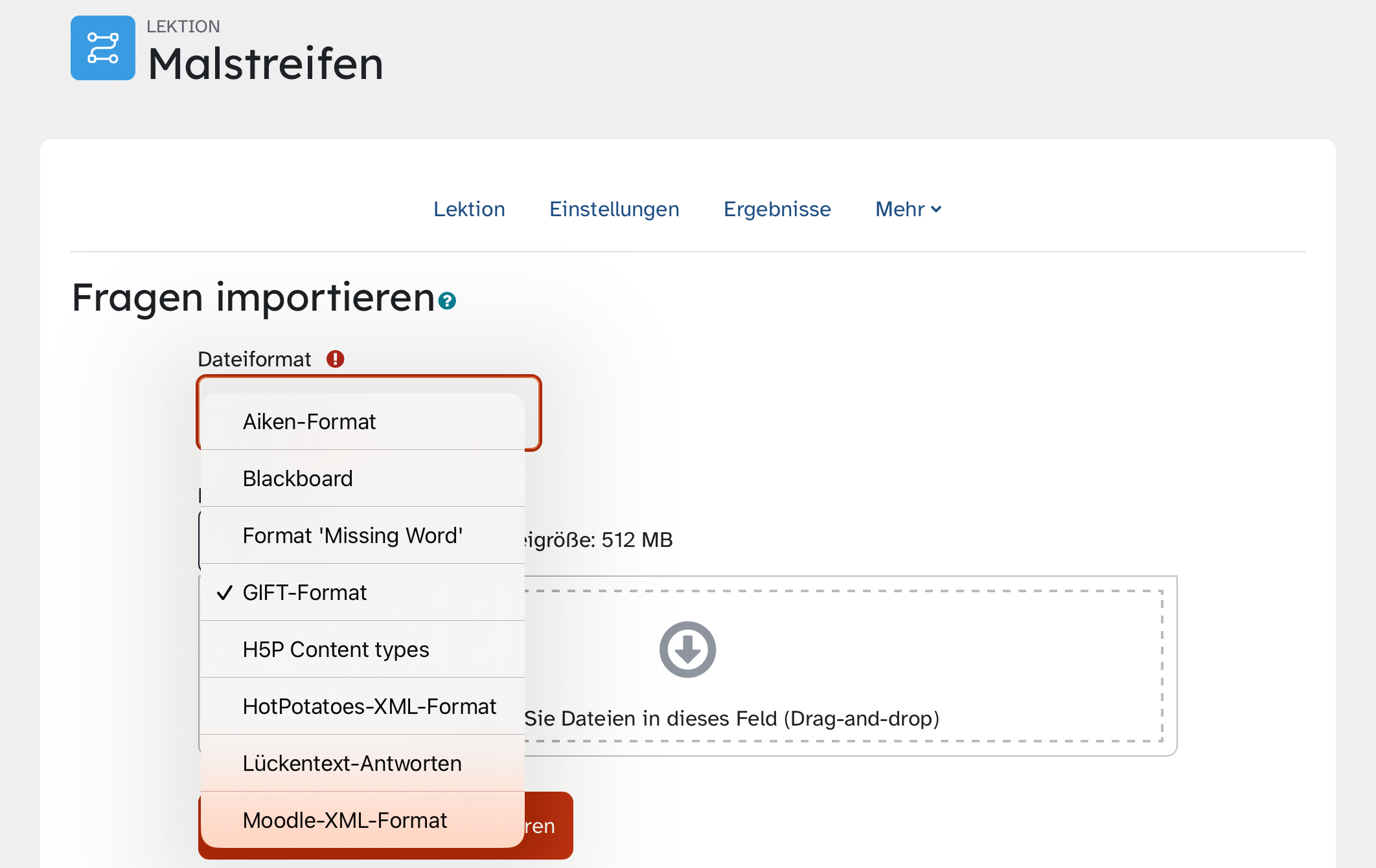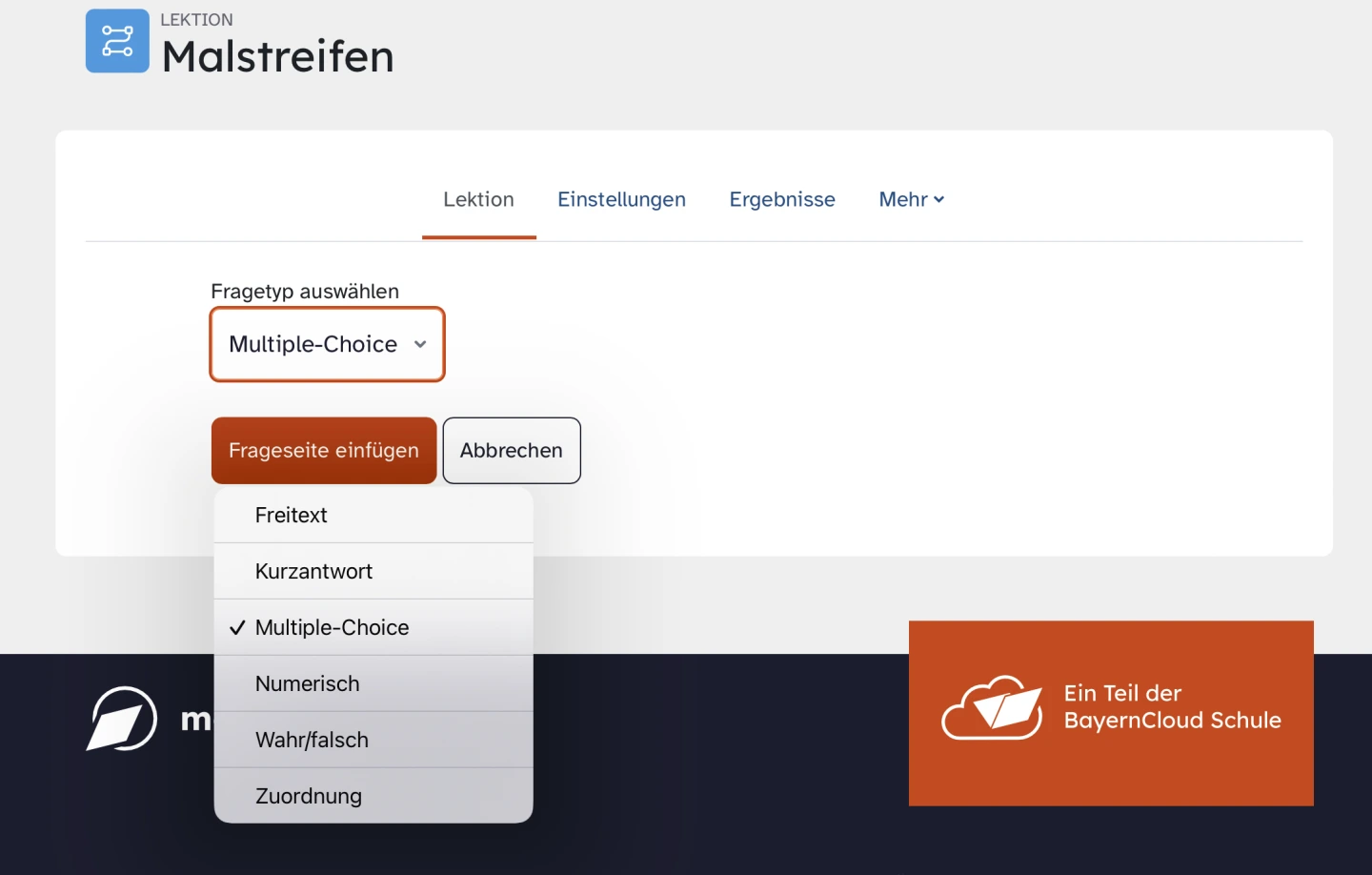 Mit der Frageseite können Sie in der Lektion verschiedene interaktive Aufgaben erstellen. Als integrierte Auswahl in der Aktivität „Lektion” stehen sechs Fragetypen zur Verfügung, die Sie direkt verlinken können.