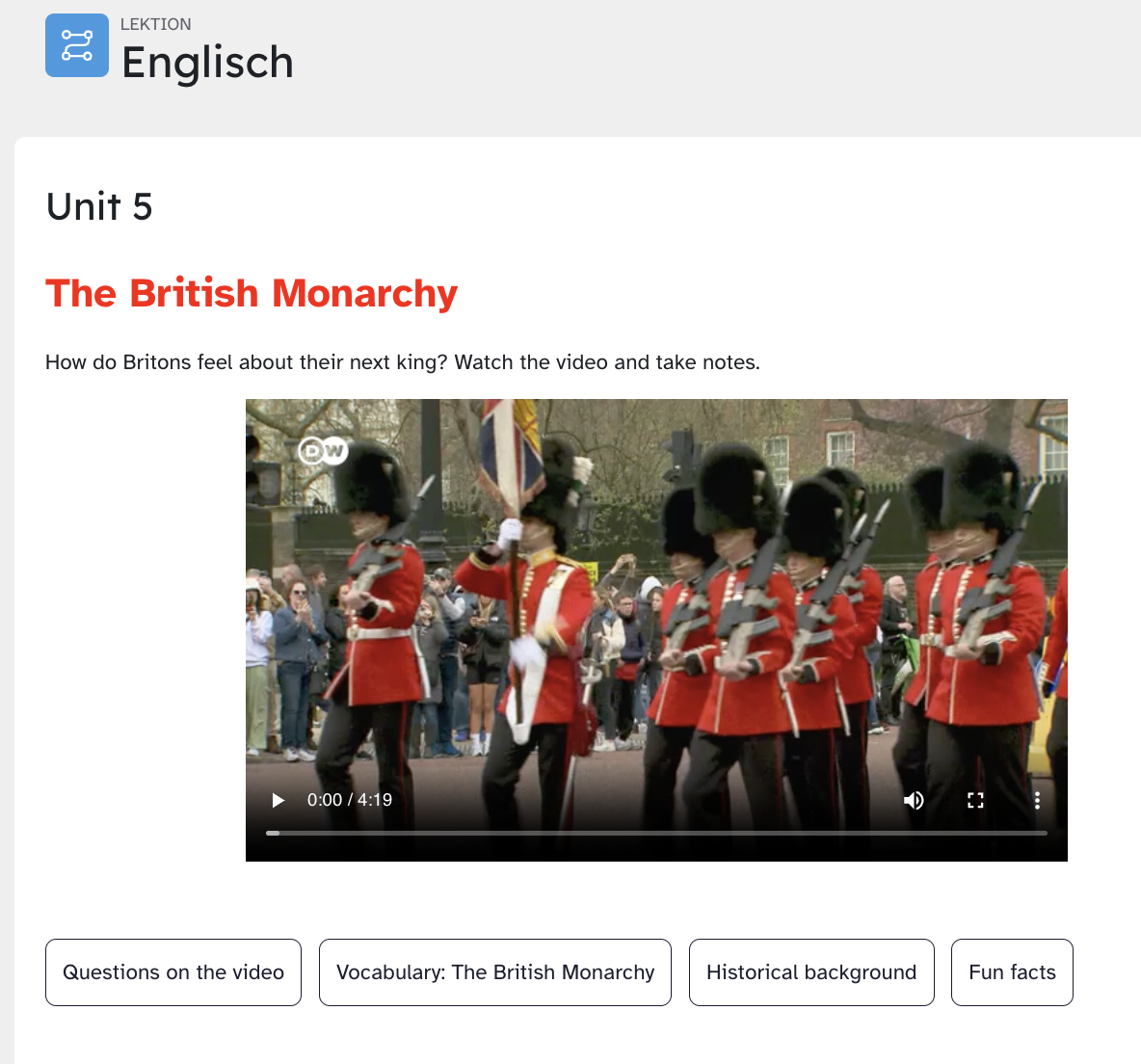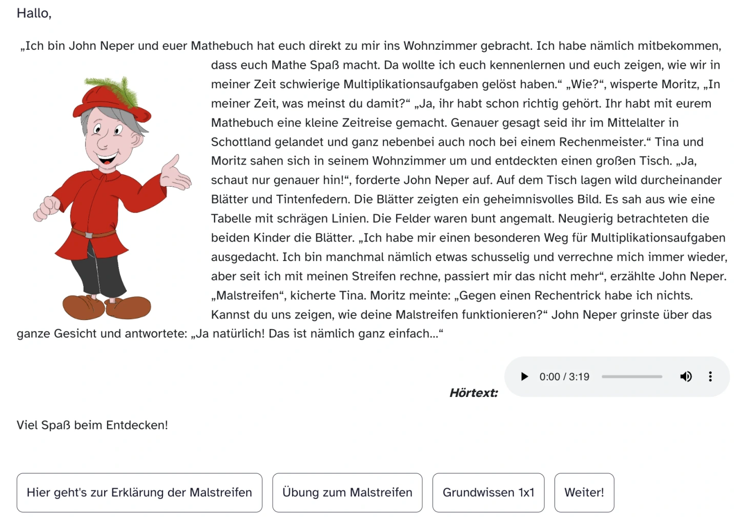 Im Grundschulunterricht können in der Lektion Informationen zum Lesen oder Hören angeboten werden. Anschließend werden die Lernenden zur Erklärung und zu den verschiedenen Übungen weitergeleitet, die sie eigenständig und mit Lösungskontrolle bearbeiten können.