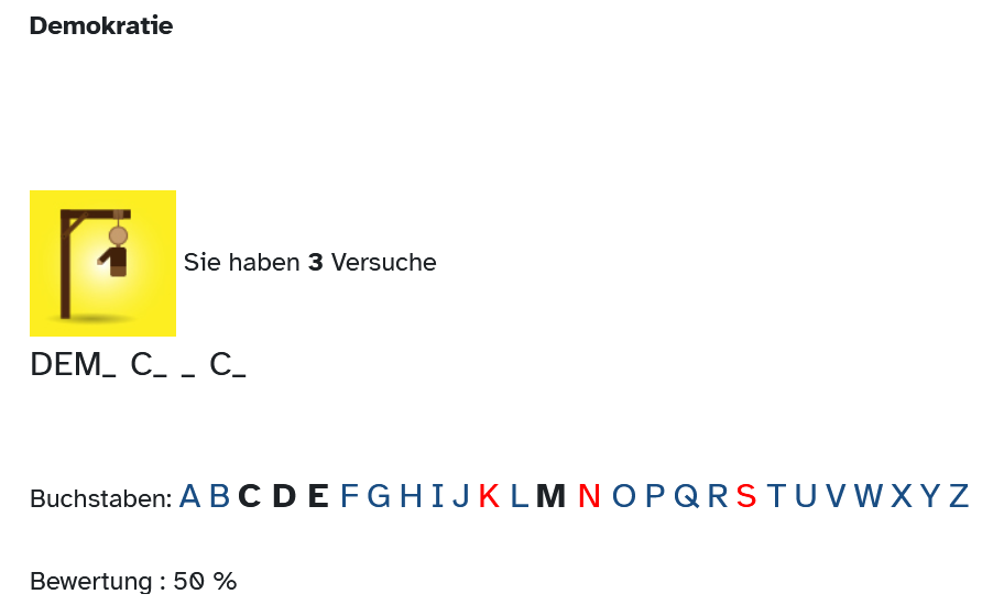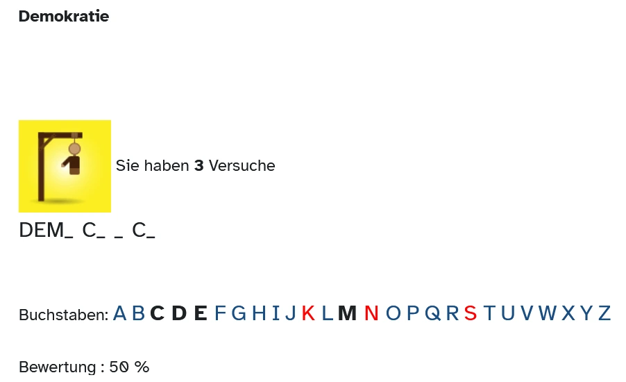 Die Spiele-Aktivität „Galgenmännchen“ ist ein Worträtselspiel, bei dem die Lernenden versuchen, ein vorgegebenes Wort zu erraten, indem sie Lösungsbuchstaben vorschlagen, wobei jeder falsche Buchstabe zu einem Teil des Galgens führt.