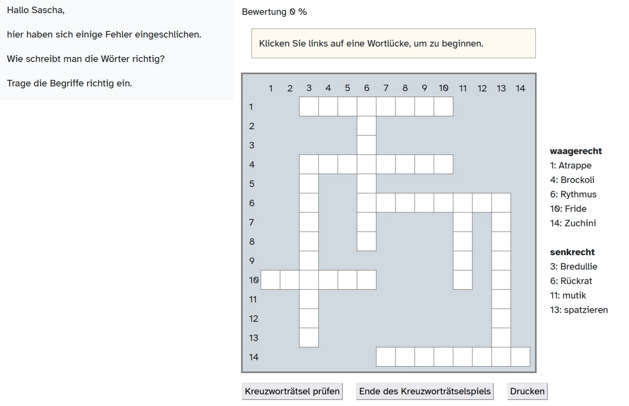 Erstellen Sie ein Kreuzworträtsel mit Wörtern, welche die Lernenden üben müssen. Auf diese Weise lernen die Schülerinnen und Schüler auf unterhaltsame und interaktive Weise, wie man neue Wörter richtig buchstabiert.