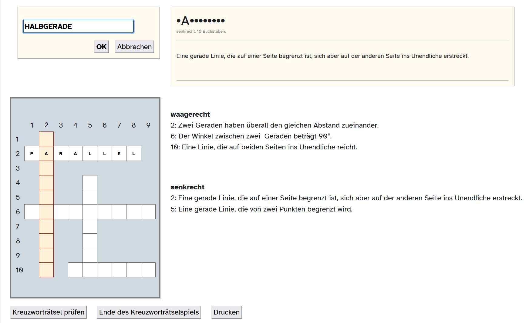 Die Spiele-Aktivität „Kreuzworträtsel“ in mebis unterscheidet sich nicht von einem klassischen Kreuzworträtsel in Papierform. Es ist ein Spiel oder Rätsel, welches aus Gitterfeldern besteht, das mit Buchstaben gefüllt werden muss. Das Ziel ist es, alle Wörter richtig zu erraten und in das Gitter einzutragen, um das Rätsel zu lösen.