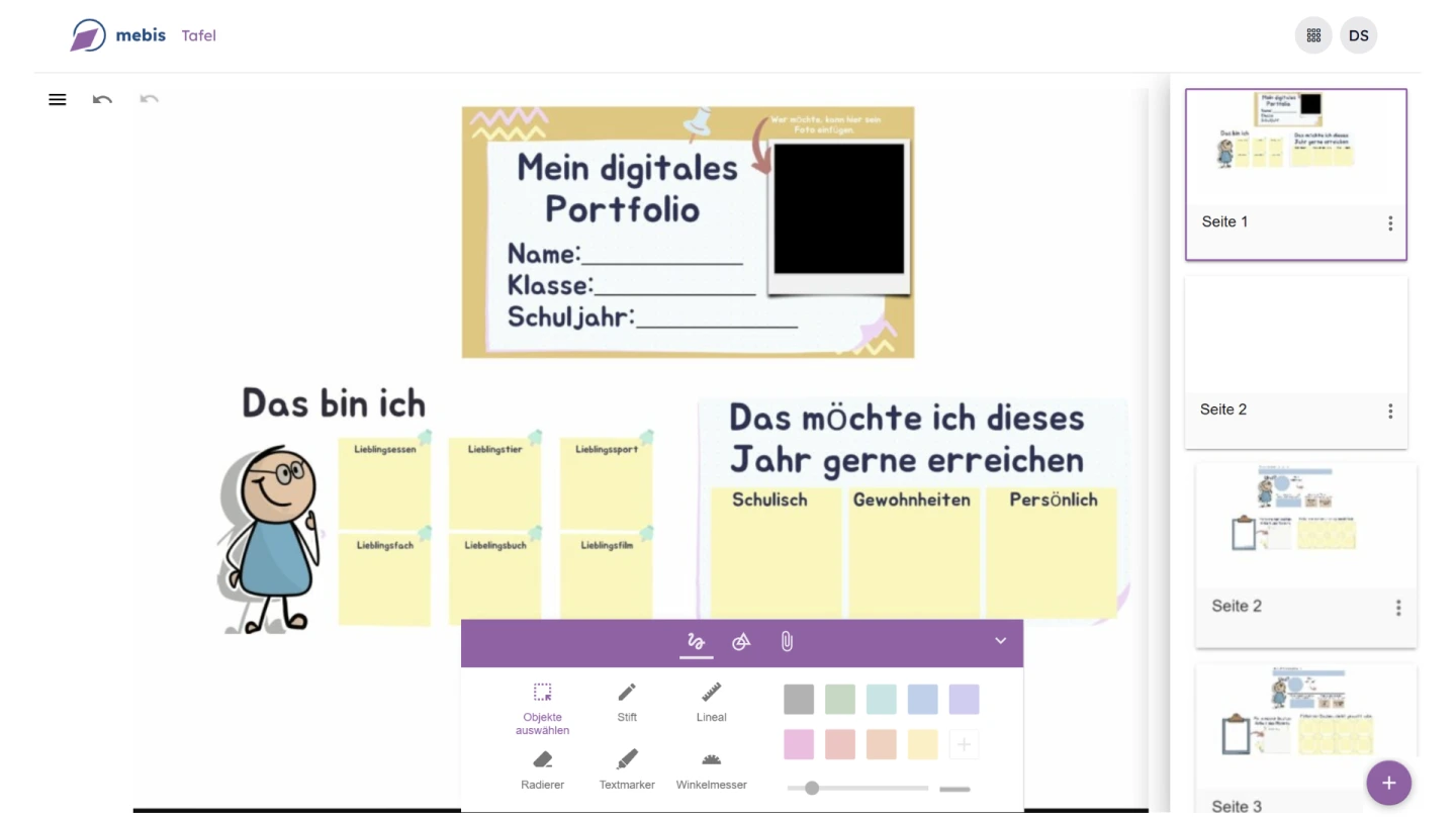 Mit der mebis Tafel steht Ihnen ein Werkzeug mit umfangreichen Möglichkeiten zur Verfügung, das trotzdem einfach bedienbar bleibt. Erstellen Sie ansprechende multimediale Tafelbilder oder digitale Arbeitsblätter mit interaktiven Aufgaben. Schülerinnen und Schüler nutzen die Tafel zum Erstellen von Mitschriften, Notizen oder multimedialen Plakaten, in die Links, Videos oder andere multimediale Inhalte eingebunden werden können.