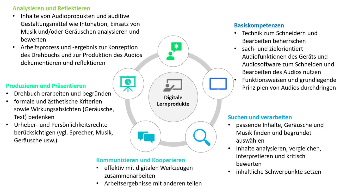 Hier finden Sie wichtige Hinweise und Praxisimpulse, wie Sie Lernende anleiten, bei der Erstellung eines Audioprodukts begleiten und das Produkt bewerten können.