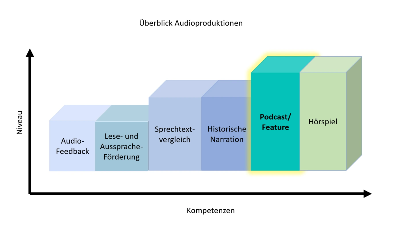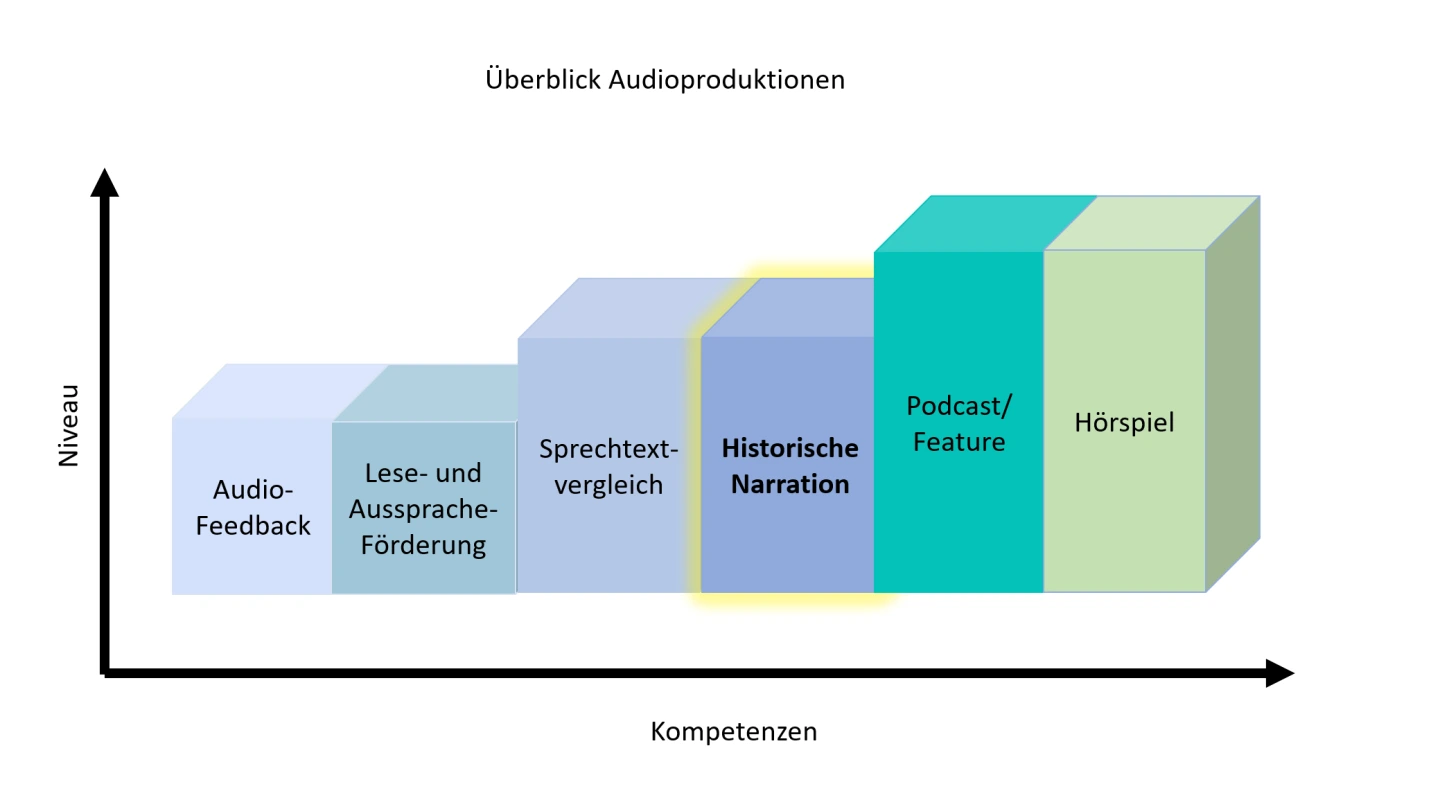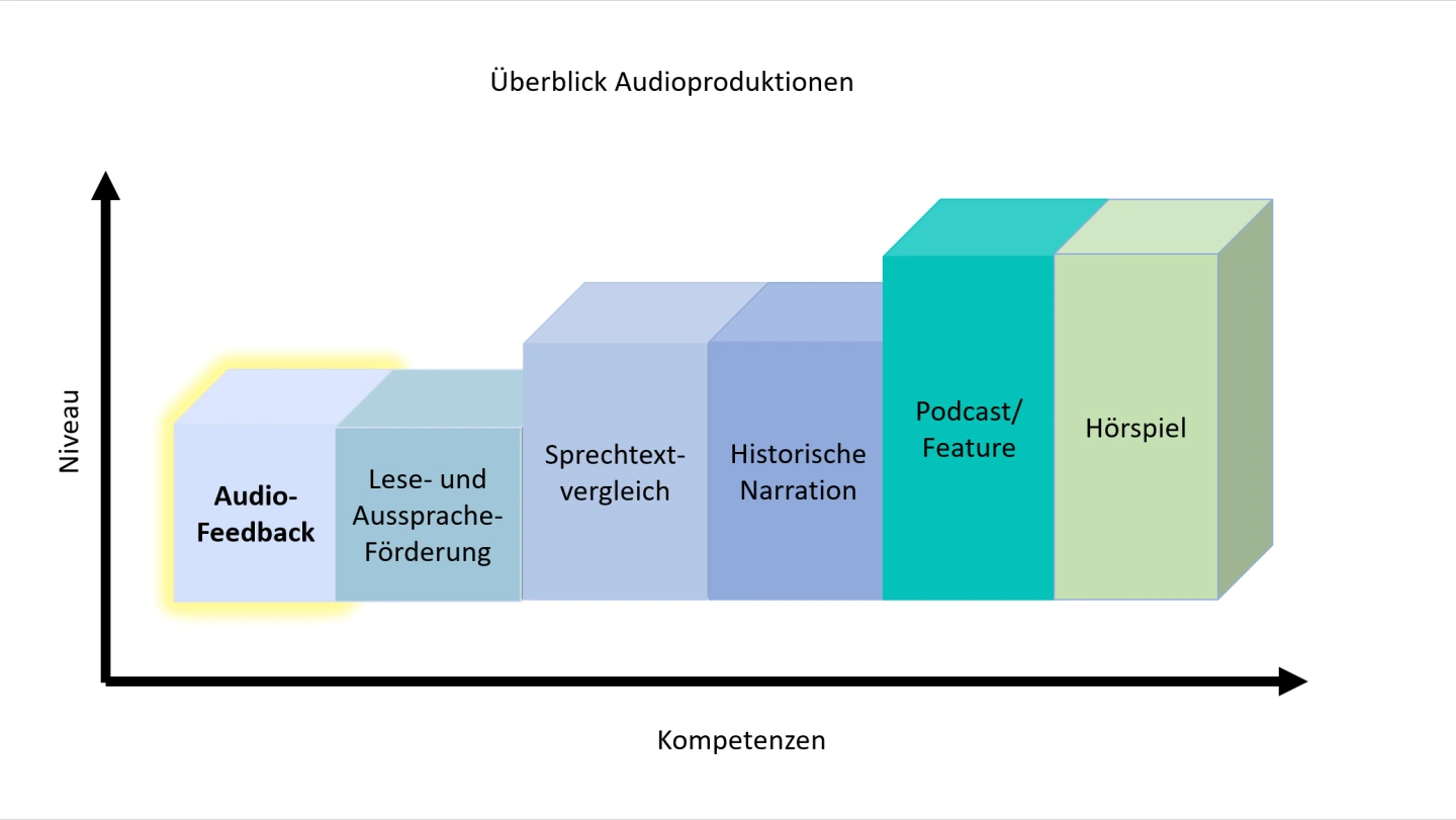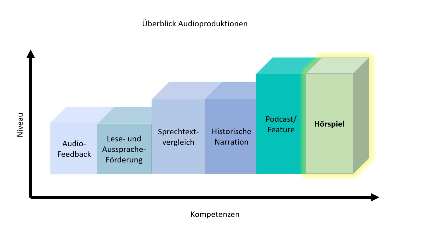 Audioproduktionen können auf vielfältige Art und Weise im Unterricht eingesetzt werden. Sie erhalten hier zunächst einen Überblick der wichtigsten Methoden. Dabei wurden die Einsatzszenarien nach dem Schwierigkeitsgrad für die Lernenden sortiert.