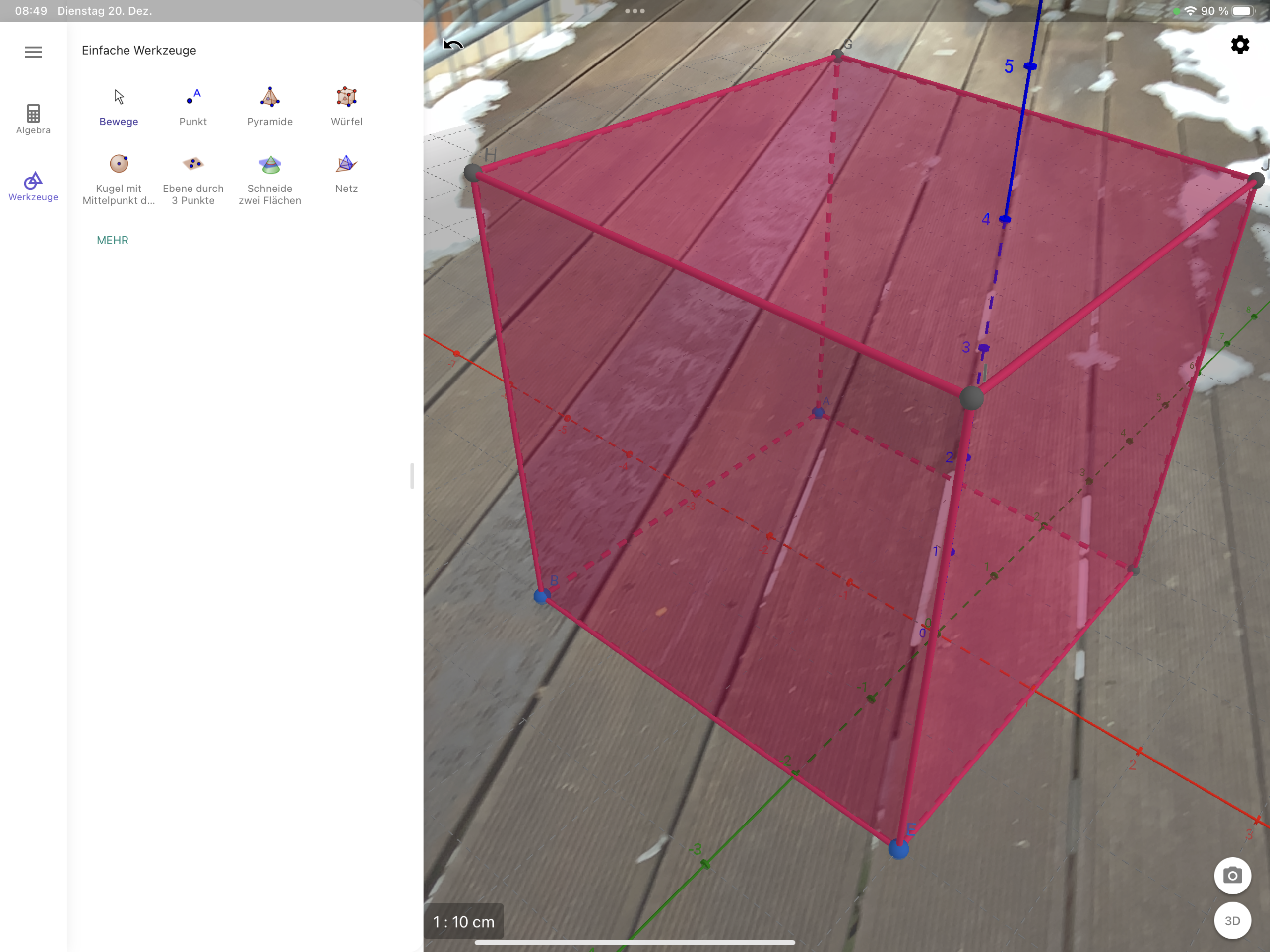 Augmented-Reality-Apps greifen auf die Kamerafunktion zu, um Daten anzuzeigen oder virtuelle Objekte im Raum erscheinen zu lassen. So können dreidimensionale Gegenstände im Raum simuliert werden, die von Schülerinnen und Schülern von allen Seiten betrachtet und teilweise sogar verändert werden können.