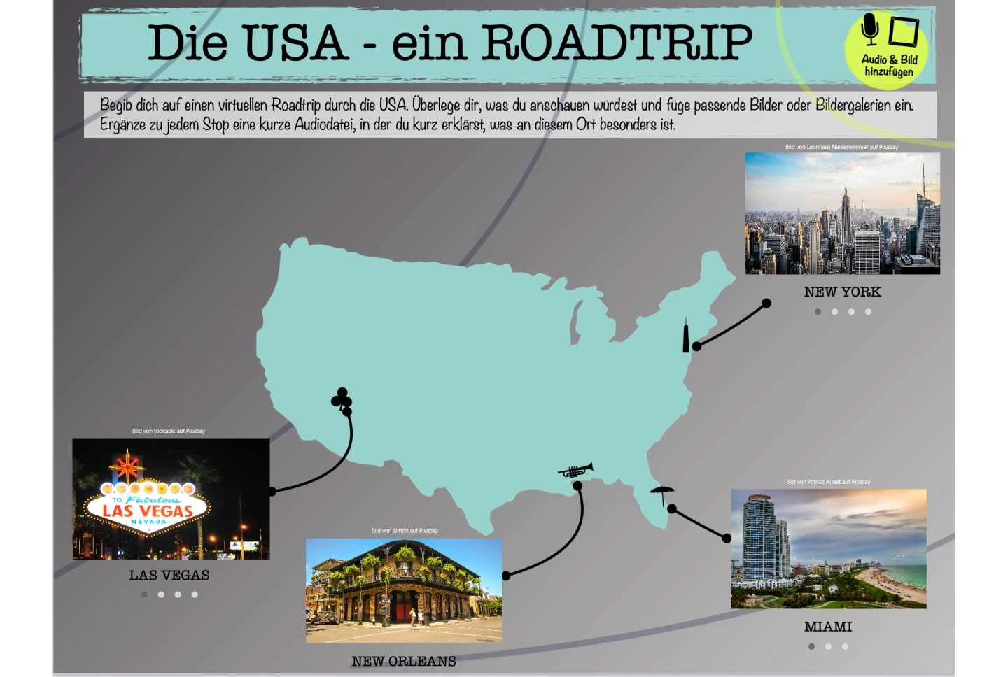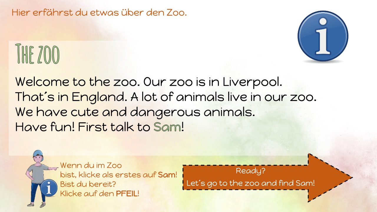 Das lineare Format (hier: Ausgangsfolie mit Bild) ermöglicht die Vorgabe einer klaren Reihenfolge der zu bearbeitenden Aufgaben oder anzuwendenden Methoden. Mittels Hyperlinks gelangen die Lernenden im vorliegenden Beispiel durch das Anklicken einzelner Stationen zu einem integrierten Textabschnitt. Nach jedem Lesen werden sie wieder zum Wimmelbild zurückgeführt.