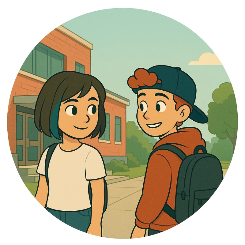 Lina und Samir stehen am Schulhofausgang. Das Tablet ist in Samirs Rucksack verstaut. Beide schauen kurz zurück.