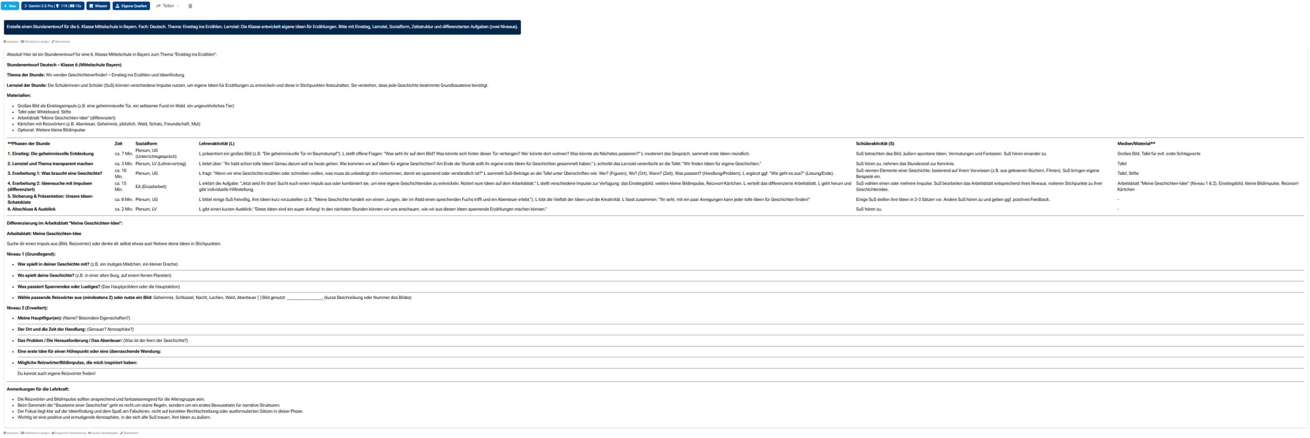 Geben Sie Fach, Jahrgangsstufe, Thema, Ziel und Strukturwünsche an (z. B. Zeitvorgaben, Differenzierung). Ein klar formulierter Prompt ergibt deutlich bessere Vorschläge.