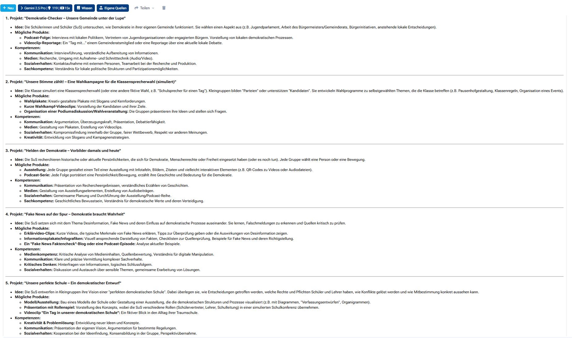 Die Klassenleitung der 8. Klasse möchte ein Projekt zum Thema „Demokratie erleben“ starten. Einige Schülerinnen und Schüler sind sehr kreativ, andere tun sich mit dem schriftlichen Ausdruck schwer. Ihr Ziel ist, dass die Klasse ein gemeinsames Produkt erstellt, bei dem alle entsprechend ihrer Stärken mitwirken können – zum Beispiel als Redakteur, Zeichnerin oder Sprecher. Die Lehrkraft nutzt ein KI-Tool, um erste Projektideen, mögliche Produkte und geeignete Sozialformen zu sammeln – abgestimmt auf den GPG-Lehrplan.