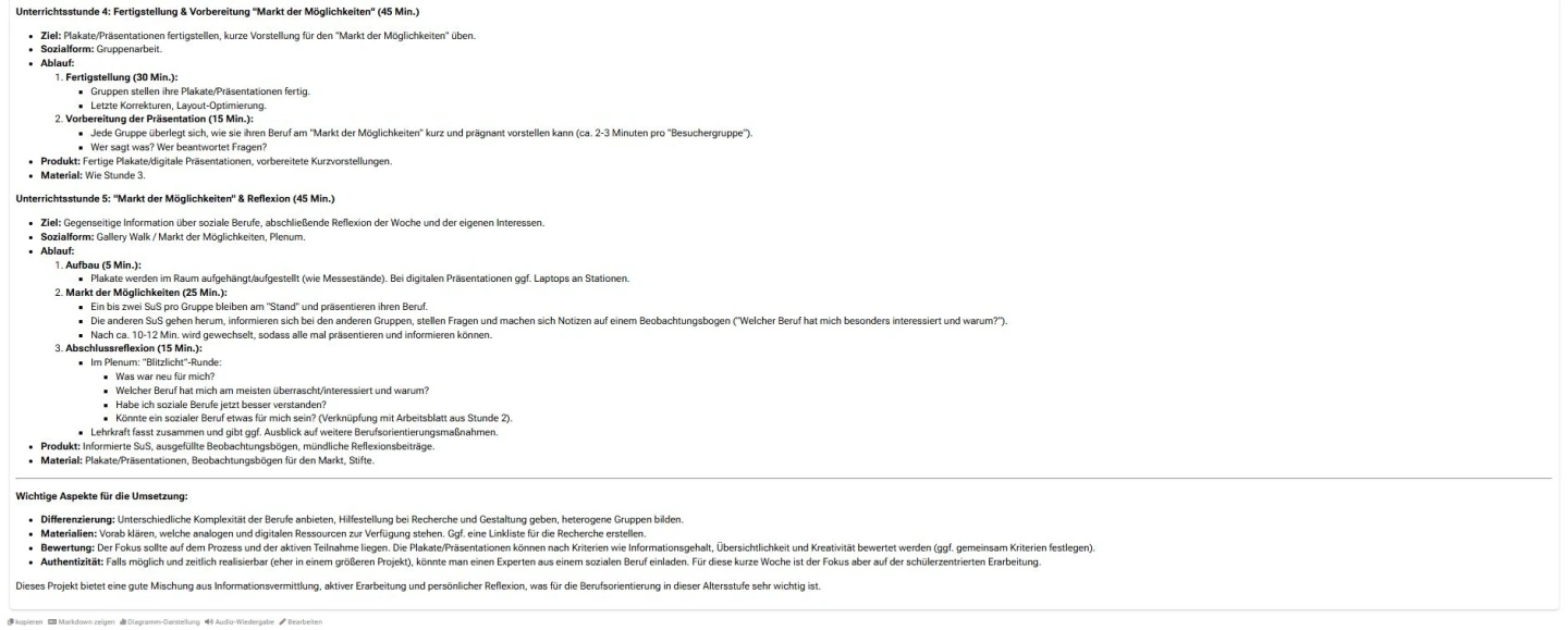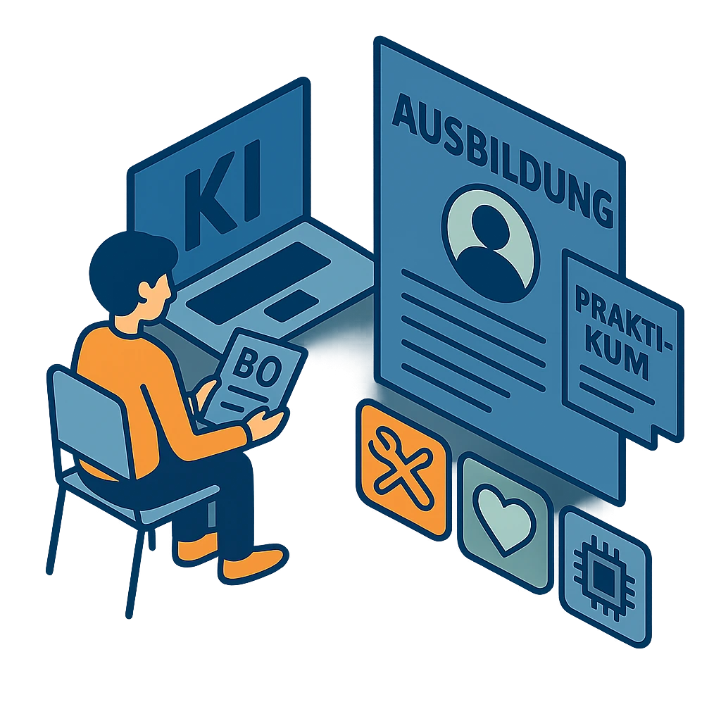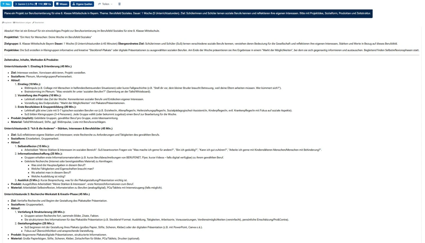 Herr Götz möchte mit seiner Klasse ein Projekt zur Vorbereitung auf die Praktikumswoche durchführen. Ziel ist, verschiedene Berufsfelder kennenzulernen und die eigenen Stärken einzuschätzen. Die Klasse ist leistungsheterogen, viele Jugendliche haben noch wenig Vorstellung vom Berufsleben. Herr Götz bittet ein KI-Tool um Unterstützung. Er gibt Berufsfeld, Zeitrahmen und grobe Zielsetzung ein. Die KI schlägt ihm mehrere Projektideen vor – z. B. eine „Berufe-Rallye“, eine Plakatserie und Interviews mit Auszubildenden. Daraus entwickelt er in kurzer Zeit einen umsetzbaren Plan – abgestimmt auf seine Klasse und mit regionalen Bezügen.