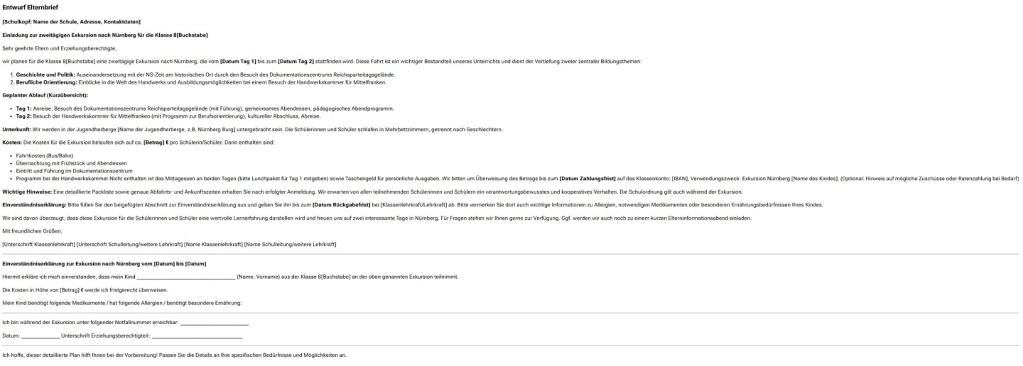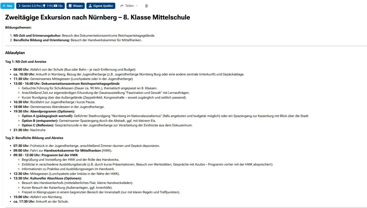 Herr Schäfer möchte mit seiner 8. Klasse eine zweitägige Exkursion nach Nürnberg unternehmen. Ziel ist es, historische und berufliche Lernorte miteinander zu verknüpfen. Neben der pädagogischen Planung (z. B. Lernziele, Arbeitsaufträge) muss er auch an Zeitstruktur, Pausen, Regeln und Elternkommunikation denken – ihm fehlt jedoch die Zeit für die Recherche und Strukturierung. Er nutzt ein KI-Tool und gibt eine präzise Eingabe ein: Ort, Dauer, Zielgruppe, gewünschte Bildungsthemen. Die KI schlägt ihm einen möglichen Ablaufplan vor, inklusive methodischer Ideen, Checkliste für die Vorbereitung und einem Infotext für Eltern. Nach kritischer Durchsicht passt er den Vorschlag an seine Klasse an.