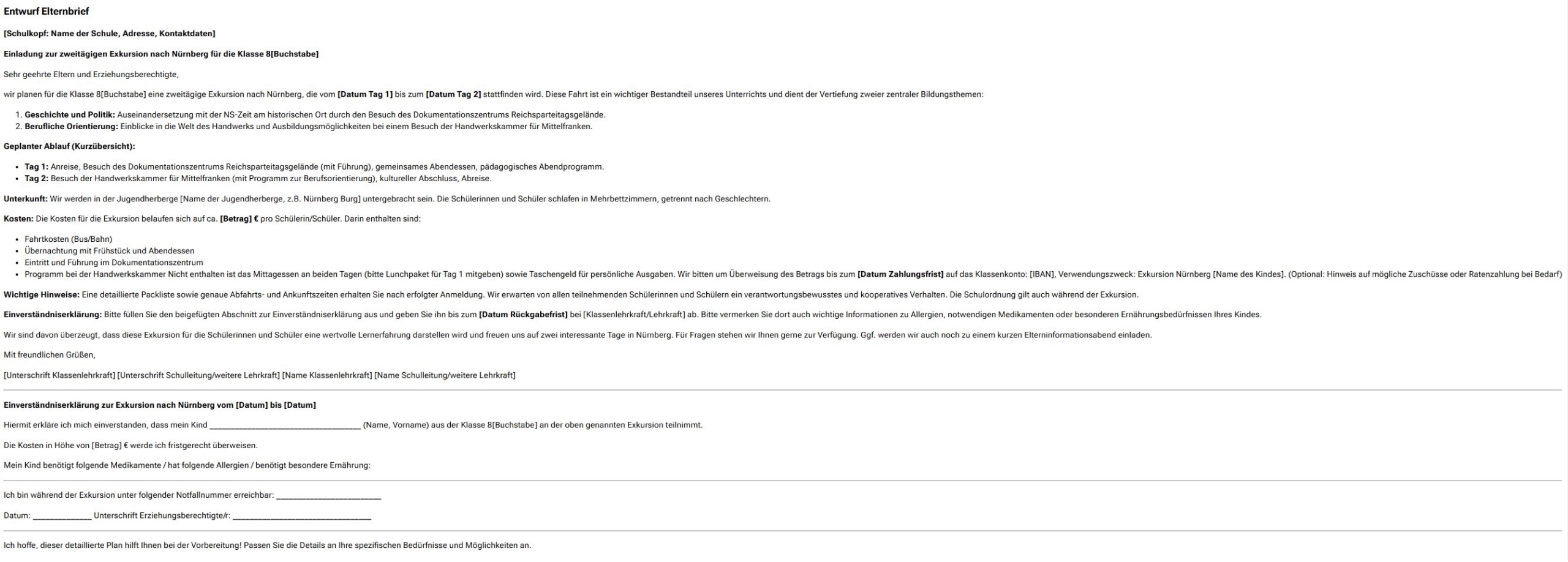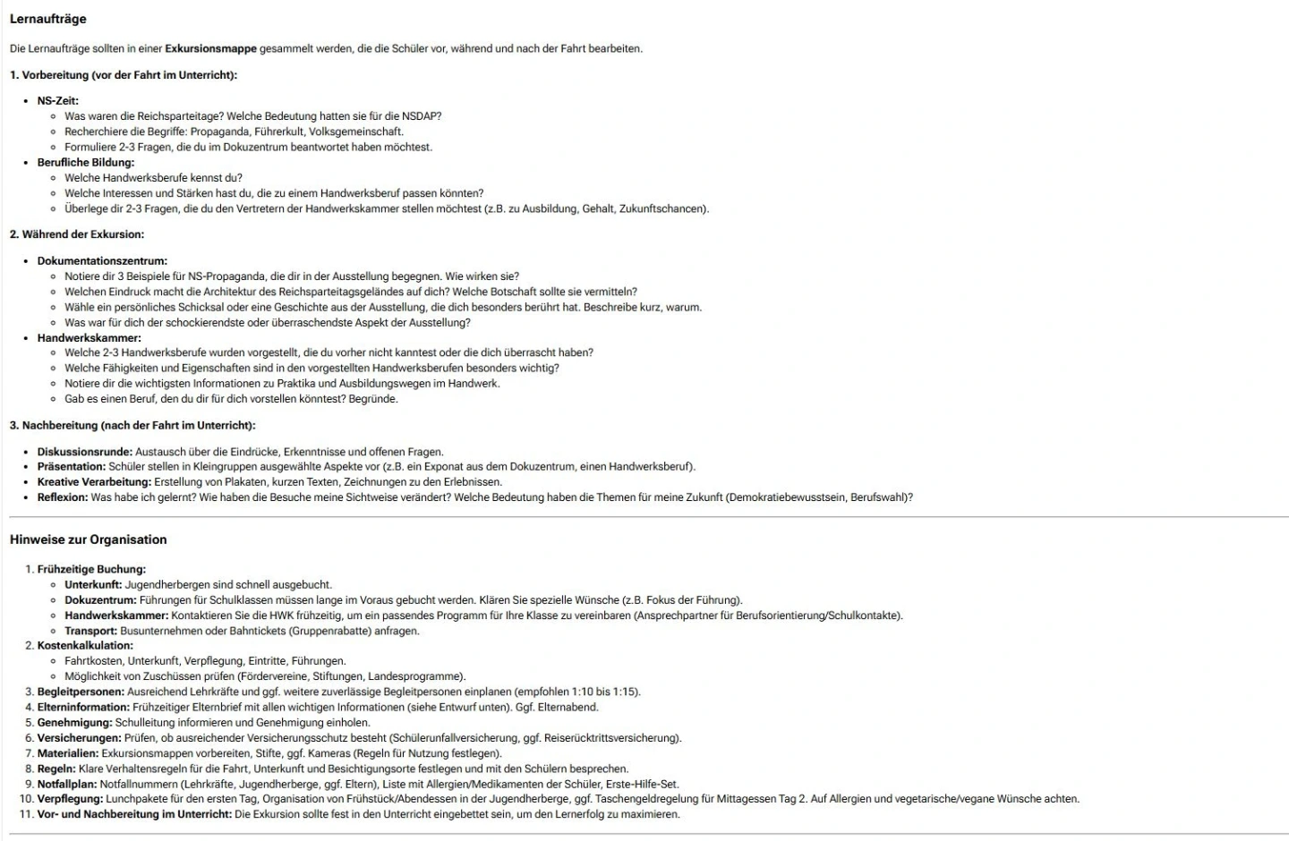 Plane eine zweitägige Exkursion nach Nürnberg für eine 8. Klasse Mittelschule in Bayern. Bildungsthemen: NS-Zeit (Dokumentationszentrum) und Berufliche Bildung (Handwerkskammer). Gib mir einen Ablaufplan, Lernaufträge, Hinweise zur Organisation und einen Entwurf für einen Elternbrief.