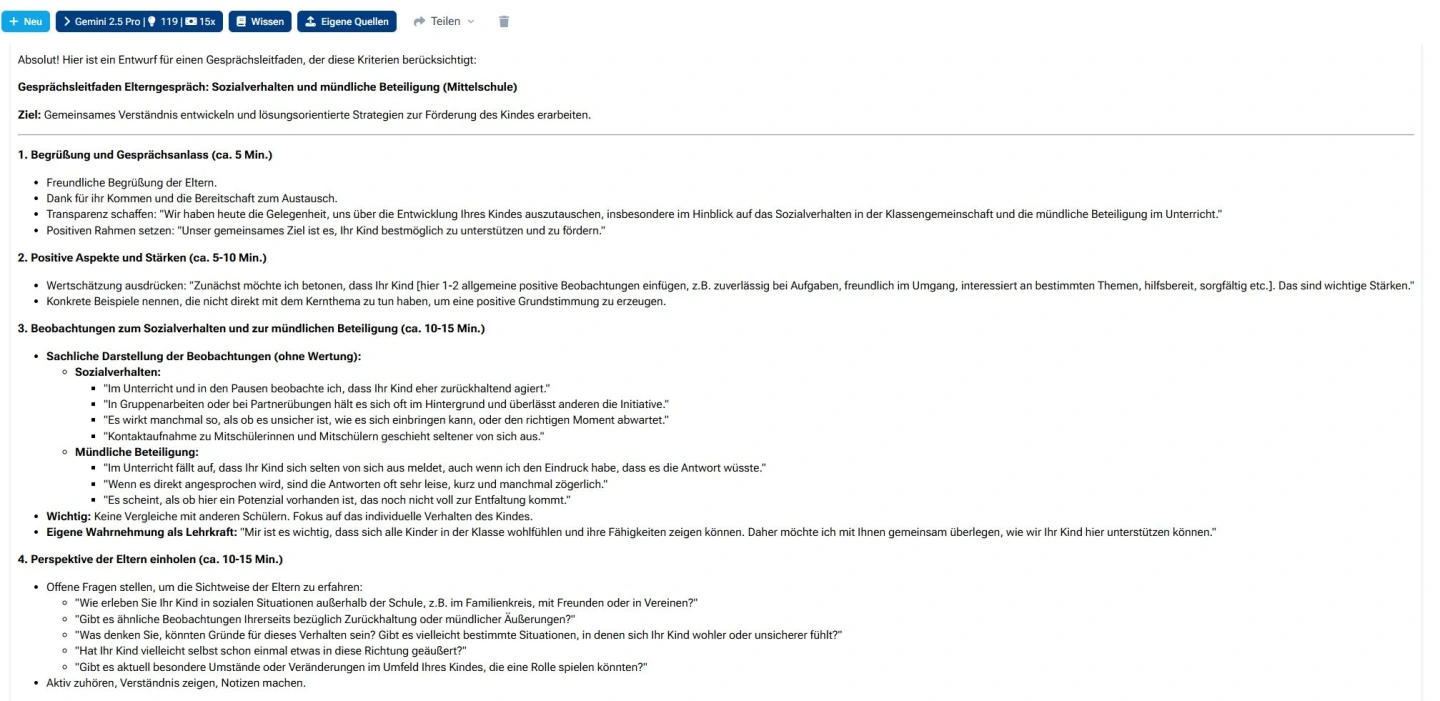 Ob Lernentwicklungsgespräch, Rückmeldung zur Sozialkompetenz oder Vorbereitung auf den Elternsprechtag: Viele Lehrkräfte wünschen sich sprachliche Unterstützung, um Beobachtungen sachlich, strukturiert und positiv zu formulieren. KI kann hier als Werkzeug dienen – etwa für Gesprächsleitfäden oder Protokollentwürfe. Wichtig: Es dürfen dabei keine personenbezogenen Daten eingegeben werden.