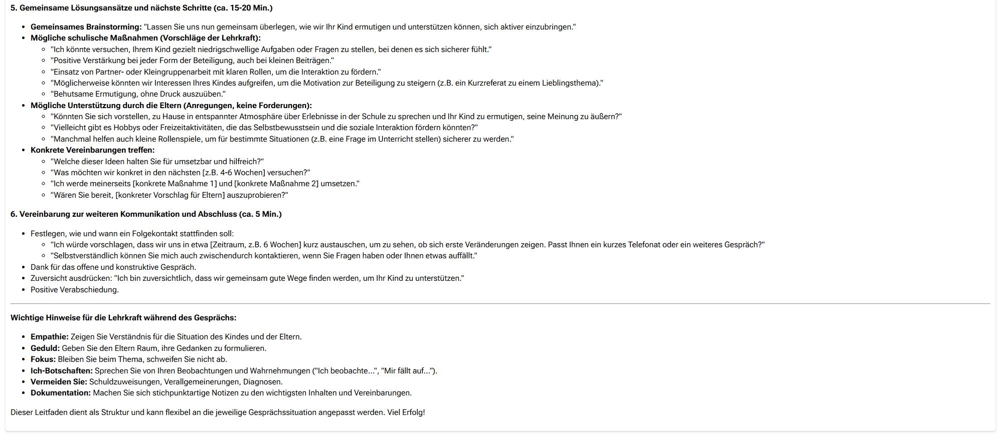 Herr Krüger hat in der kommenden Woche fünf Elterngespräche zu führen – mit ganz unterschiedlichen Anliegen. Um sich sprachlich gut vorzubereiten, gibt er anonymisierte Hinweise in ein KI-Tool ein, z. B.: „Schüler zeigt zurückhaltendes Sozialverhalten, mündliche Beteiligung gering, Aufgaben werden meist erledigt.“ Die KI schlägt ihm einen Gesprächsleitfaden vor: sachlich, freundlich, in positiver Grundhaltung. Herr Krüger ergänzt konkrete Beobachtungen, Förderideen und Gesprächsziele. So geht er gut vorbereitet und strukturiert in die Gespräche – ohne dass sensible Daten in die KI eingeflossen sind.