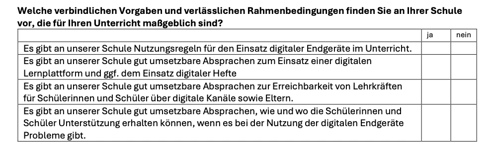 Präventive Maßnahmen für einen bewussten Umgang mit dem Ablenkungspotenzial digitaler Medien werden in die Unterrichtsplanung und -gestaltung integriert. Regeln in den Bereichen digitale Kommunikation, Arbeitsweise und Erreichbarkeit werden konsequent und angemessen umgesetzt.