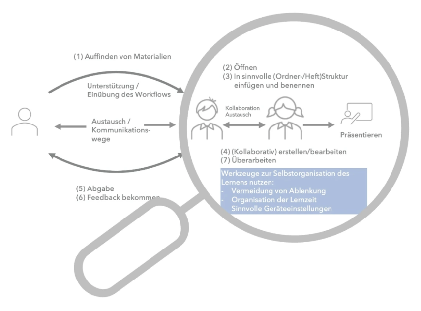 Eine vorbereitete digitale Lernumgebung unterstützt reibungslose Arbeitsabläufe (z. B. Verteilen und Einsammeln von Materialien und Aufgaben über eine Lernplattform, klare Bearbeitungsfristen).
