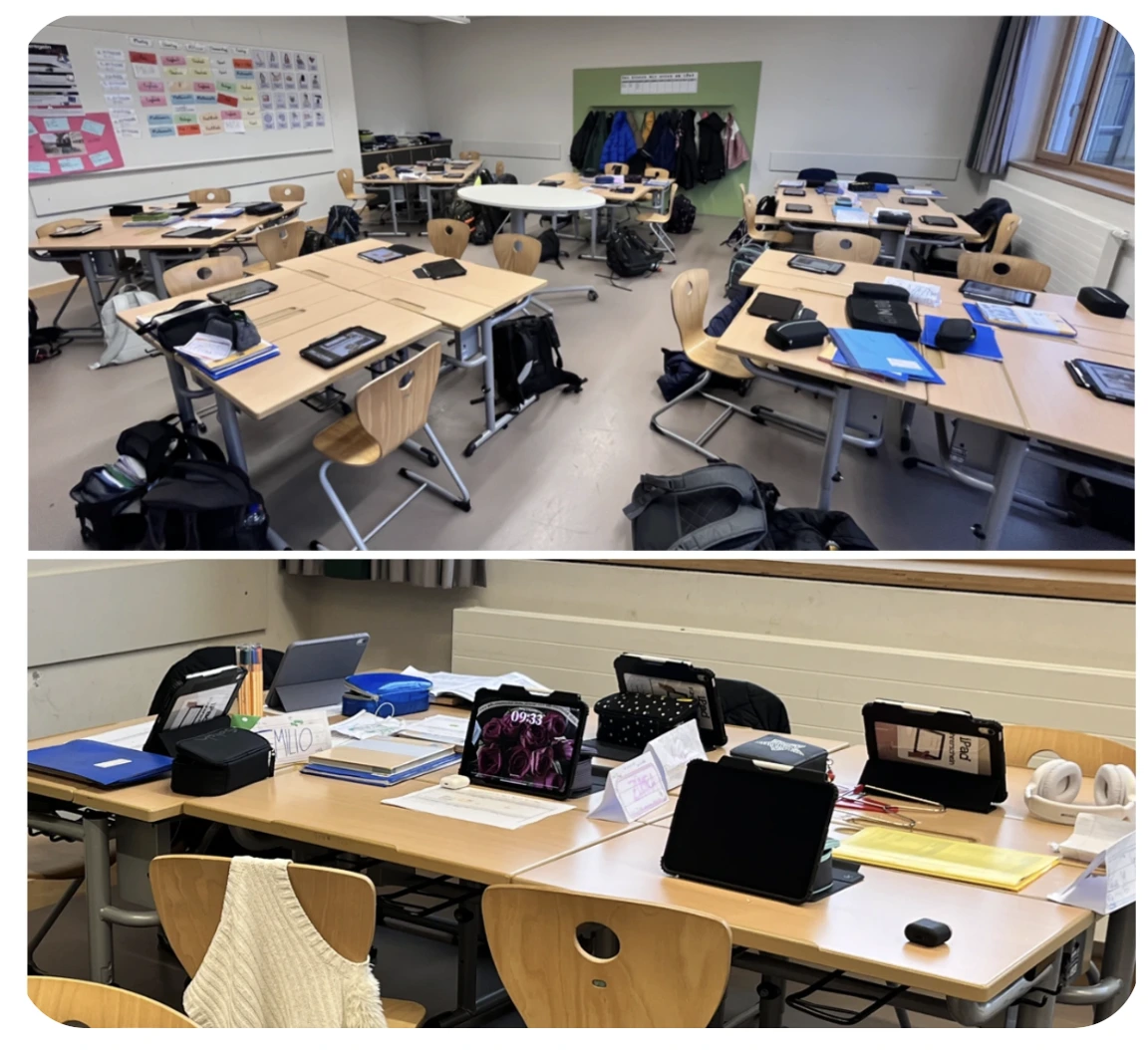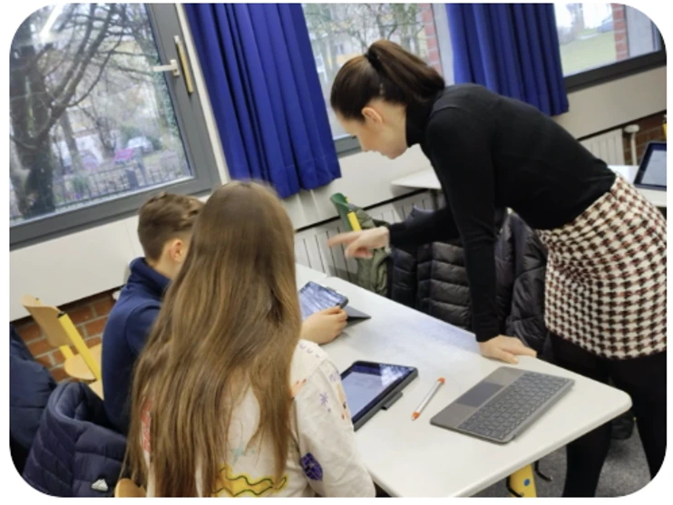 „Insbesondere während selbstgesteuerter Arbeitsphasen bewege ich mich aktiv im Klassenzimmer, um präsent zu sein und Arbeitsprozesse gut beobachten zu können. So erkenne ich schnell typische Anzeichen von Ablenkung und kann direkt eingreifen. Durch genügend Raum hinter der letzten Reihe kann ich auch dort Position beziehen und eine zusätzliche Perspektive einnehmen. Gelegentlich setze ich mich auch direkt in die Sitzreihen, etwa wenn Schülerinnen und Schüler ihre Arbeitsergebnisse vom Tablet aus präsentieren – so bin ich näher am Lernprozess und kann gezielter unterstützen.“