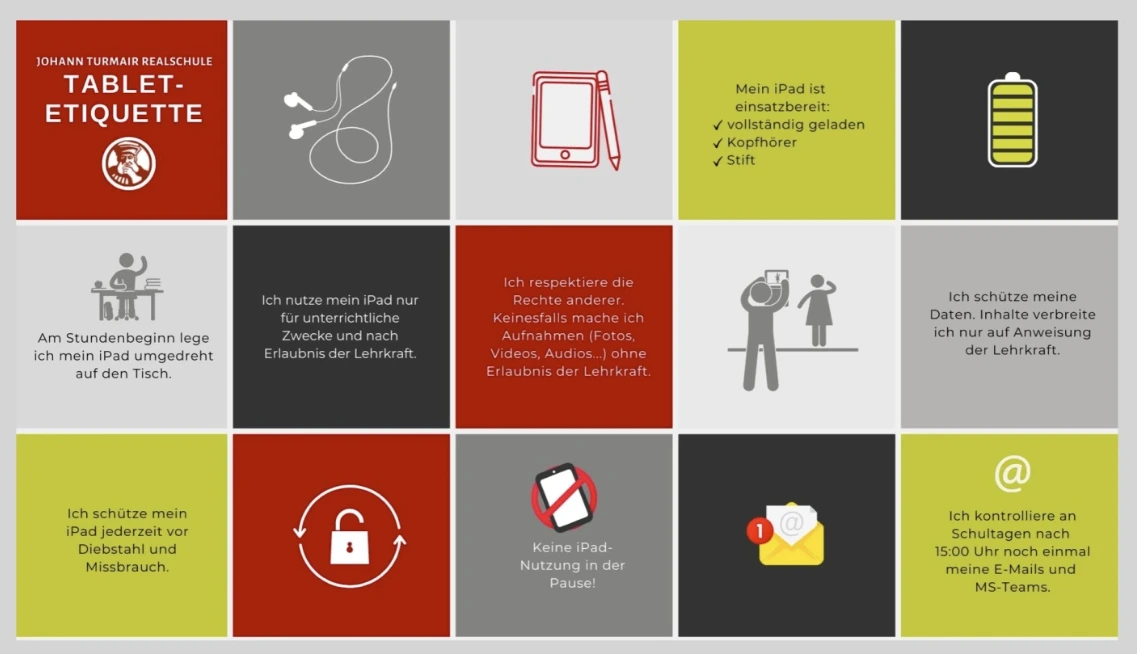 „Innerhalb der Schulfamilie wurden verbindliche Regeln zur Nutzung der Tablets vereinbart, welche auch von allen Schülerinnen und Schülern sowie deren Eltern beim Start der Arbeit mit den Endgeräten unterschrieben werden müssen. Um die wichtigsten Punkte für den Unterricht bei den Lernenden immer präsent zu haben, wurden die Regelungen als Plakate in allen Räumen der Schule aufgehängt."