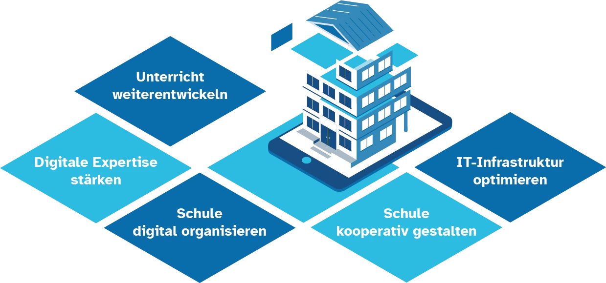 Abgeleitet vom gemeinsamen Qualitätsverständnis für den Unterricht an der eigenen Schule bzw. im eigenen Fachbereich, kann es notwendig oder wünschenswert sein, Ziele und Maßnahmen aus den weiteren Handlungsfeldern der digitalen Schulentwicklung zu definieren.
