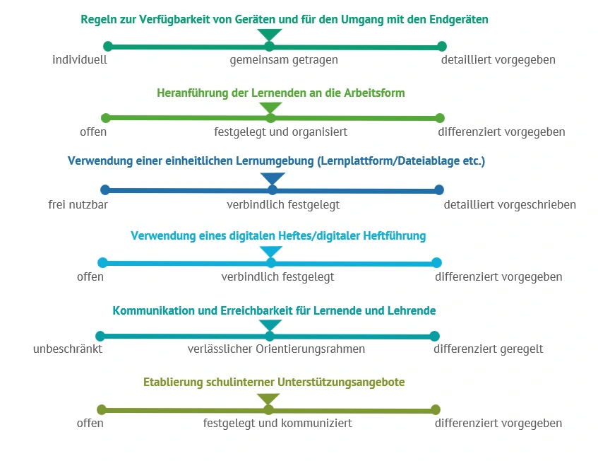 Die Unterrichtsmaterialien werden zuverlässig von allen Lehrkräften digital und analog eingestellt. Idealerweise einigt sich ein Lehrerteam auf eine einheitliche digitale Arbeitsstruktur (z. B. Dateinamen, Fächerordner, Wochenplanprinzip). Diese sollte sich auch auf den analogen Materialien wiederfinden.Aufgaben werden so konzipiert, dass sie sowohl digital als auch analog bearbeitbar sind