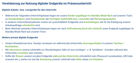 Es gelten klare Absprachen für den Umgang mit den privaten (und schulischen) Endgeräten im Unterricht im Fachbereich. Diese wurden gemeinsam mit den Lernenden verabschiedet. Diese sind allen in der Lernplattform und durch Plakat-Aushang in den Klassenzimmern zugänglich. Diese sind durch die Lernenden und gff. deren Erziehungsberechtigte zu unterzeichnen.