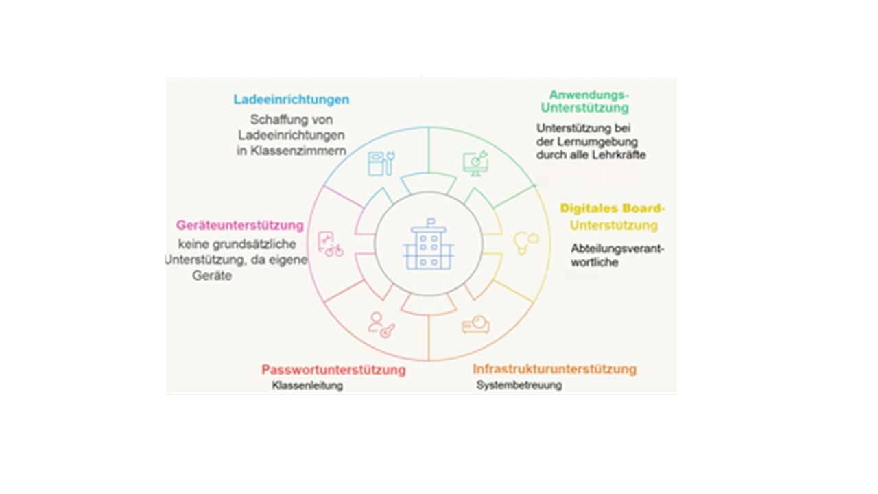 Es stehen für Ausnahmefälle Lademöglichkeiten (z. B. USB-C Kabel) bereit, damit die Endgeräte den gesamten Schultag verwendet werden können.