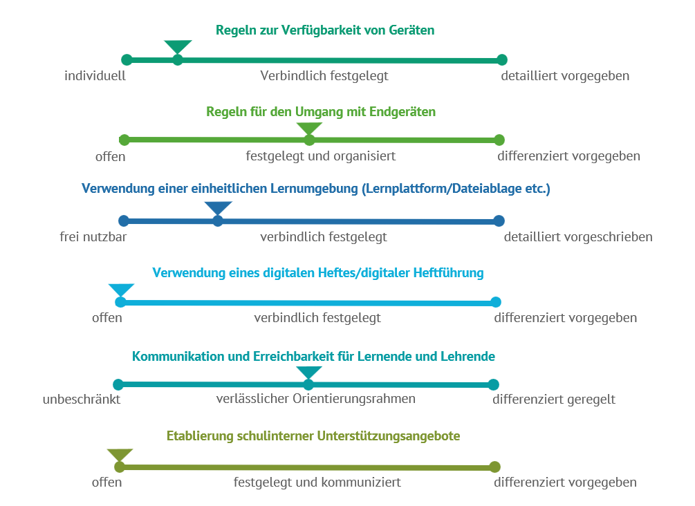 Es gibt eine schulweit einheitliche digitale Lernumgebung. Die Unterrichtsmaterialien werden dort zuverlässig von allen Lehrkräften zur Verfügung gestellt. Es gibt schulweite Benennungs- und Löschroutinen für Kurse/Gruppen in der Lernumgebung. Im Fachbereich werden zudem in einer Unterstruktur Vorgaben für Dateinamen, Fächerorder und Wochenplanprinzip festgelegt. Diese Struktur findet sich auch auf den analogen Medien wieder.