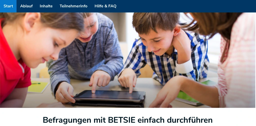 In BETSIE, kann eine Befragung zum Ist-Stand aus bereits bestehenden, thematisch unterschiedlich ausgerichteten Bausteinen individuell zusammengestellt werden. Eigene Fragen können zusätzlich ergänzt werden. Sämtliche Items können unter Downloads heruntergeladen und eingesehen werden.