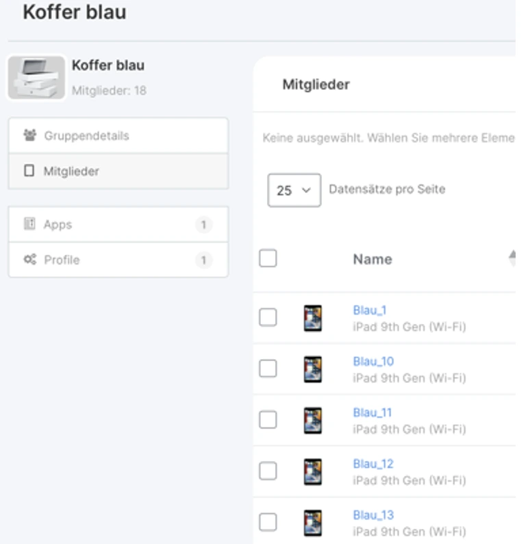 Aufbau: Gerätegruppen Koffer (WLAN, Einschränkungen, Appauswahl 1) + Koffer 1 (Hintergrund + zusätzliche Einstellungen)