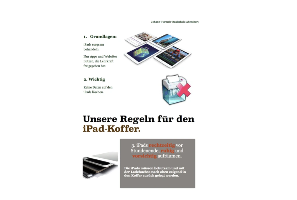 Um einen reibungslosen Ablauf im schulischen Alltag zu gewährleisten, sind gemeinsame Absprachen für die Organisation der Nutzung und Ausleihmöglichkeiten, der Aufbewahrung und des einfachen Supports notwendig. Diese sollten folgende Aspekte umfassen: