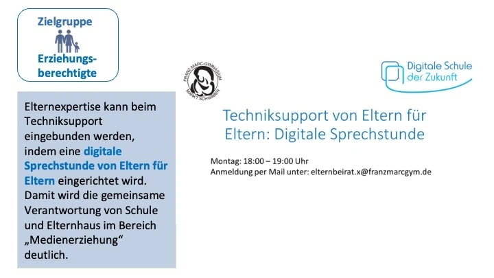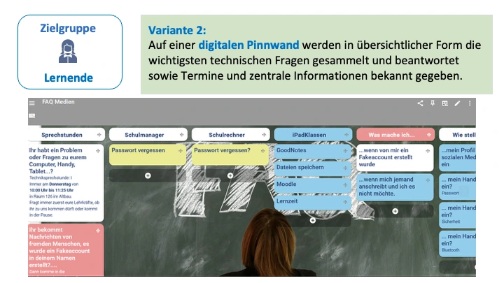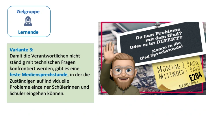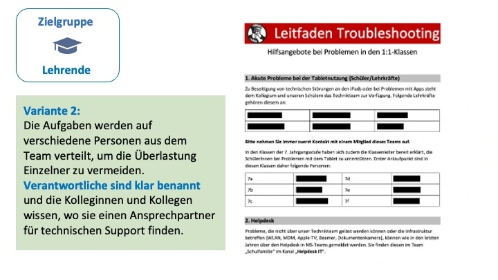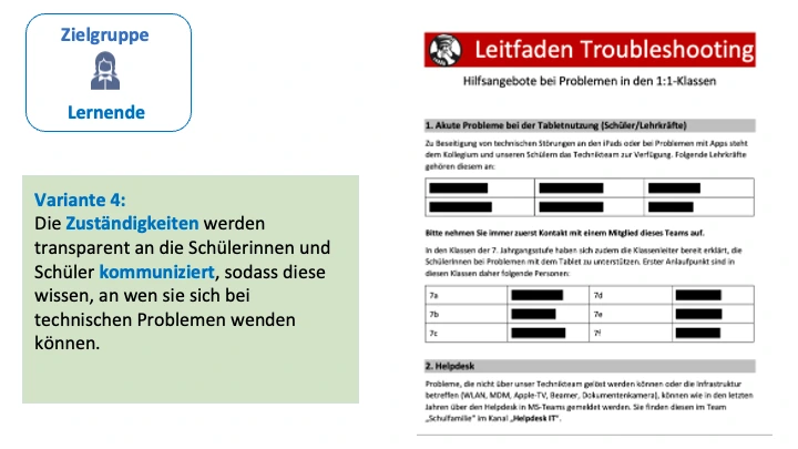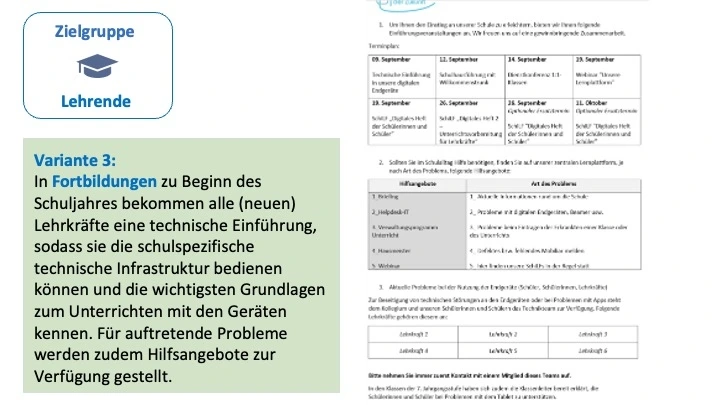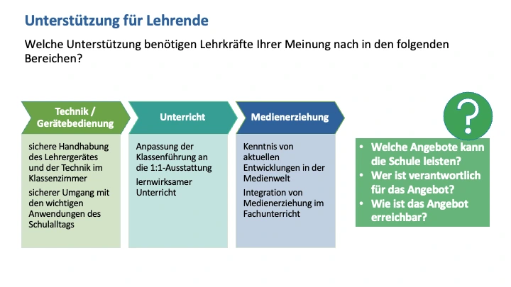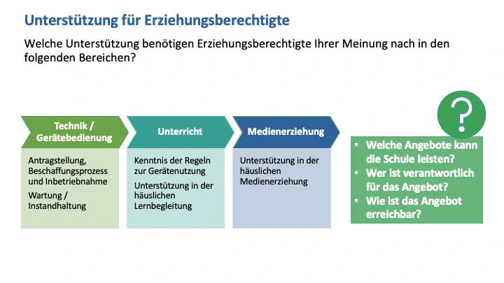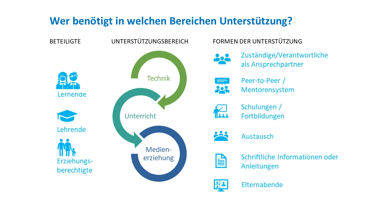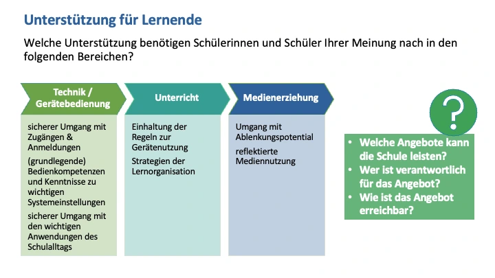 Sammeln Sie den erwarteten Unterstützungsbedarf bei Lernenden, Lehrkräften und Erziehungsberechtigten in den Bereichen Technik, Unterricht und Medienerziehung und entwickeln Sie dahingehend Unterstützungsmaßnahmen. Nutzen Sie dazu die editierbare Vorlage: