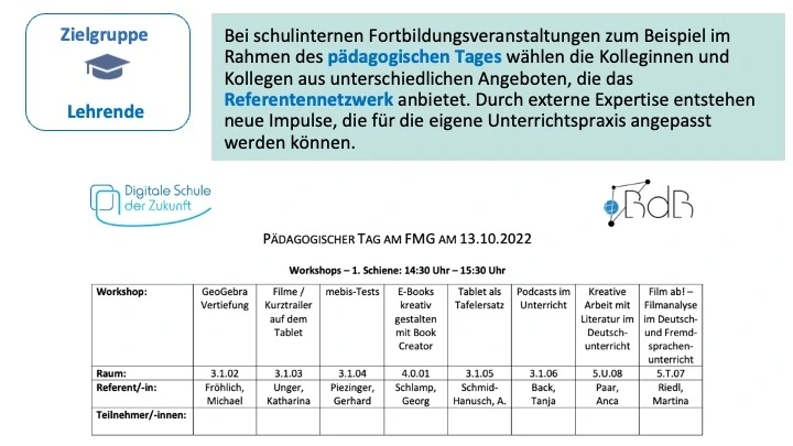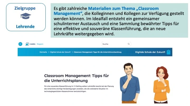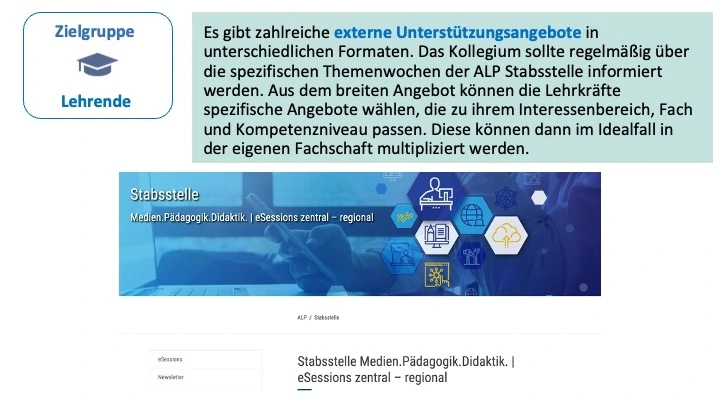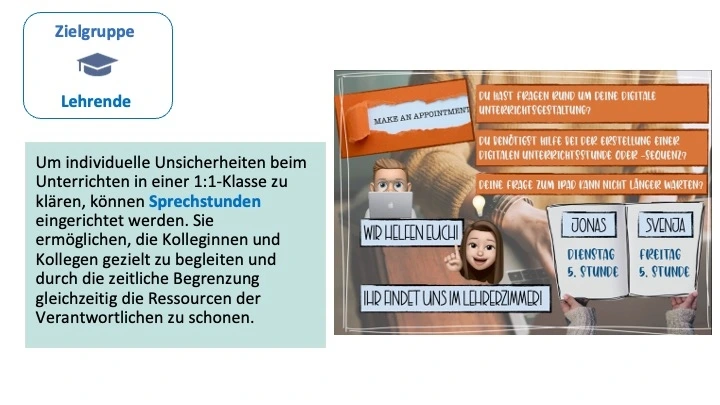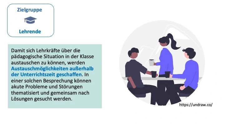 Sinnvoll ist, diese Unterstützungsmaßnahmen organisch in bestehende schulinterne Strukturen und in den Schulentwicklungsprozess einzubinden. Um Kontinuität und Flexibilität zu gewährleisten, bietet sich ein regelmäßiger wertschätzender Austausch mit Verantwortlichen und Beteiligten an.