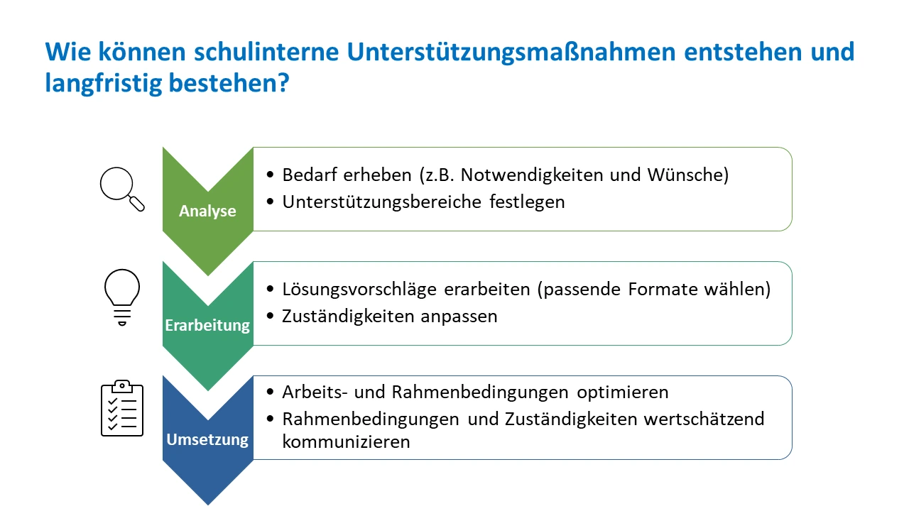 Um verlässliche Unterstützungsmaßnahmen etablieren zu können, nimmt sich die Schule im nächsten Schritt einem Handlungsbereich an und entwickelt dahingehend Unterstützungsmaßnahmen. Dazu müssen ggf. die Zuständigkeiten und Rahmenbedingungen angepasst werden. Im Anschluss ist es wichtig, das Unterstützungsangebot in geeigneter Form zu kommunizieren.