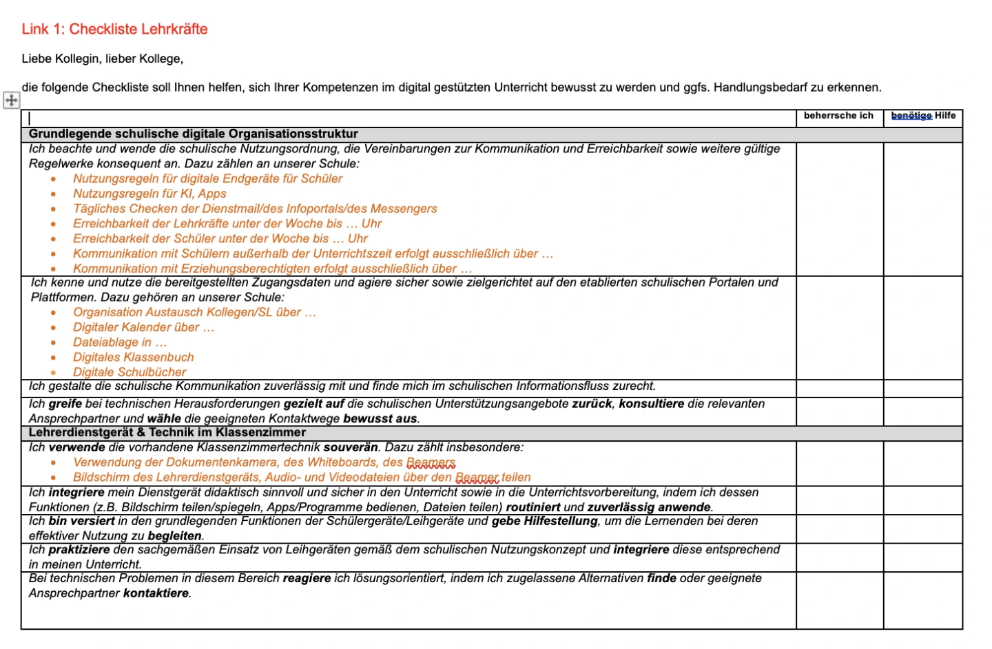 Erstellen Sie aus den von Ihnen ausgewählten Bereichen und Kompetenzen eine einfache Checkliste für alle Lehrkräfte. Passen Sie dazu die Vorlage an.