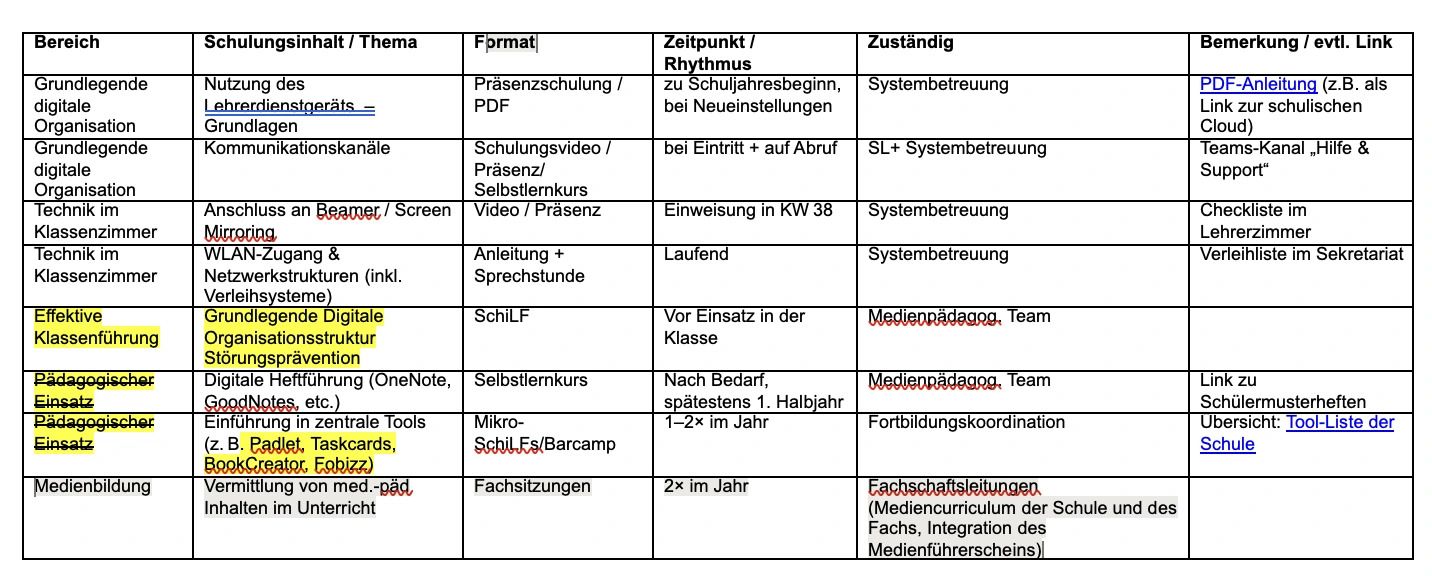 Leiten Sie aus den vorgeschlagenen Bereichen die konkreten Inhalte ab, die essenziell für das digital gestützte Unterrichten und insbesondere für eine Anpassung der Klassenführung beim Einsatz mobiler Endgeräte an Ihrer Schule sind.