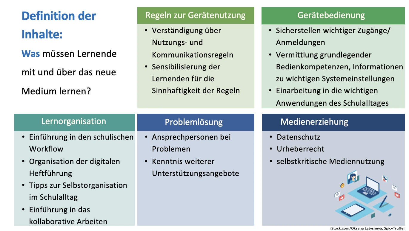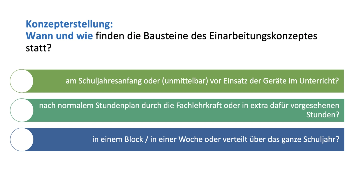 Schon vor der Beschaffung der Geräte sollten verschiedene Fragen zur Ersteinrichtung der Geräte geklärt werden, die entscheidend für die Konzeption der Anfangsstunden im Einarbeitungskonzept sind: