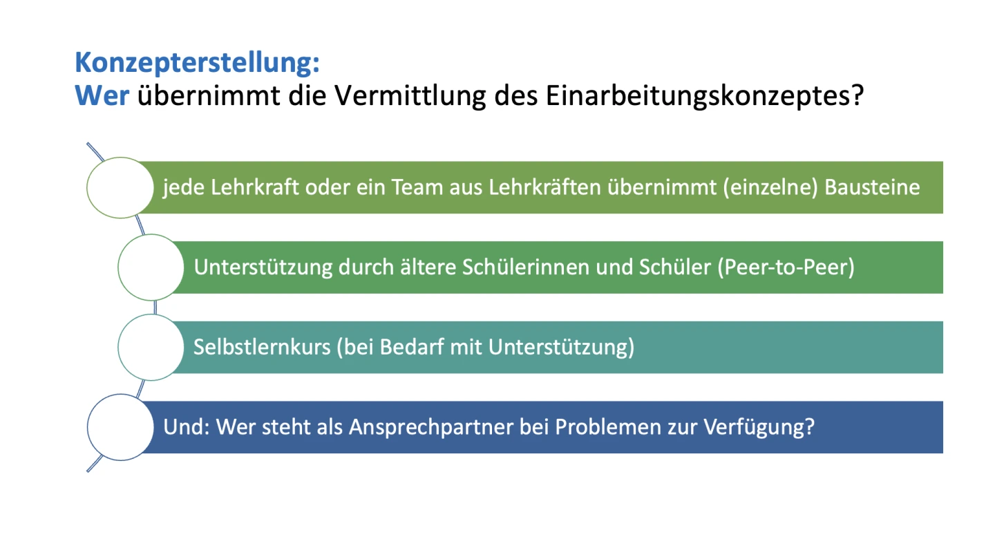 Eine entscheidende Frage ist, wer die Einführung der Geräte übernimmt. Eventuell muss das Stundenplanungsteam vorher informiert werden, um entsprechende Stunden hierfür zur Verfügung zu stellen. Alternativ müssen alle Klassenlehrkräfte fortgebildet oder ein geeigneter Selbstlernkurs für die Lernenden konzipiert werden.