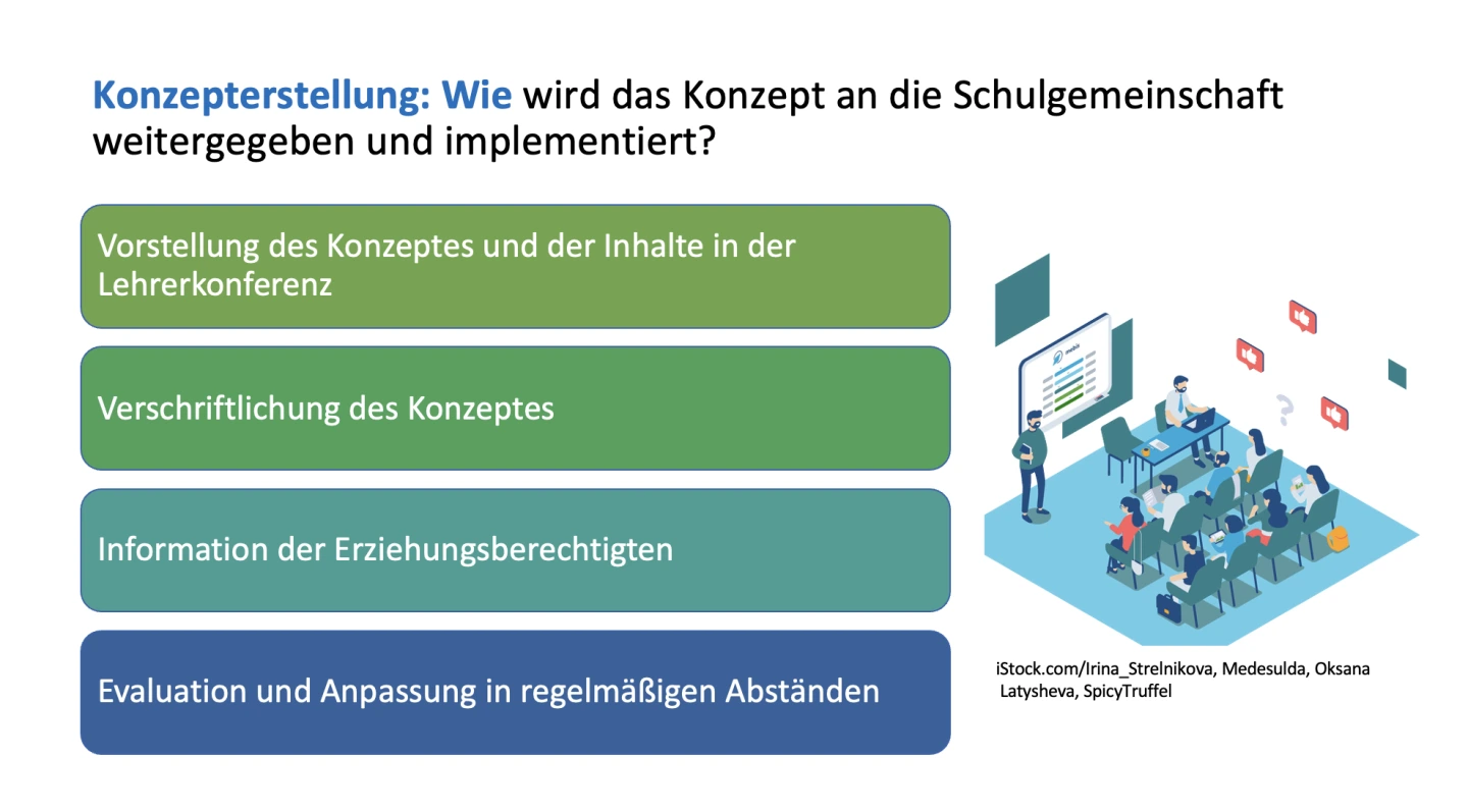 Damit alle Beteiligten immer auf dem gleichen Stand sind, bietet es sich an, das Konzept zu verschriftlichen und in geeigneter Form an das Kollegium sowie die Erziehungsberechtigten weiterzugeben. Des Weiteren sollte es bei Bedarf überarbeitet und angepasst werden.