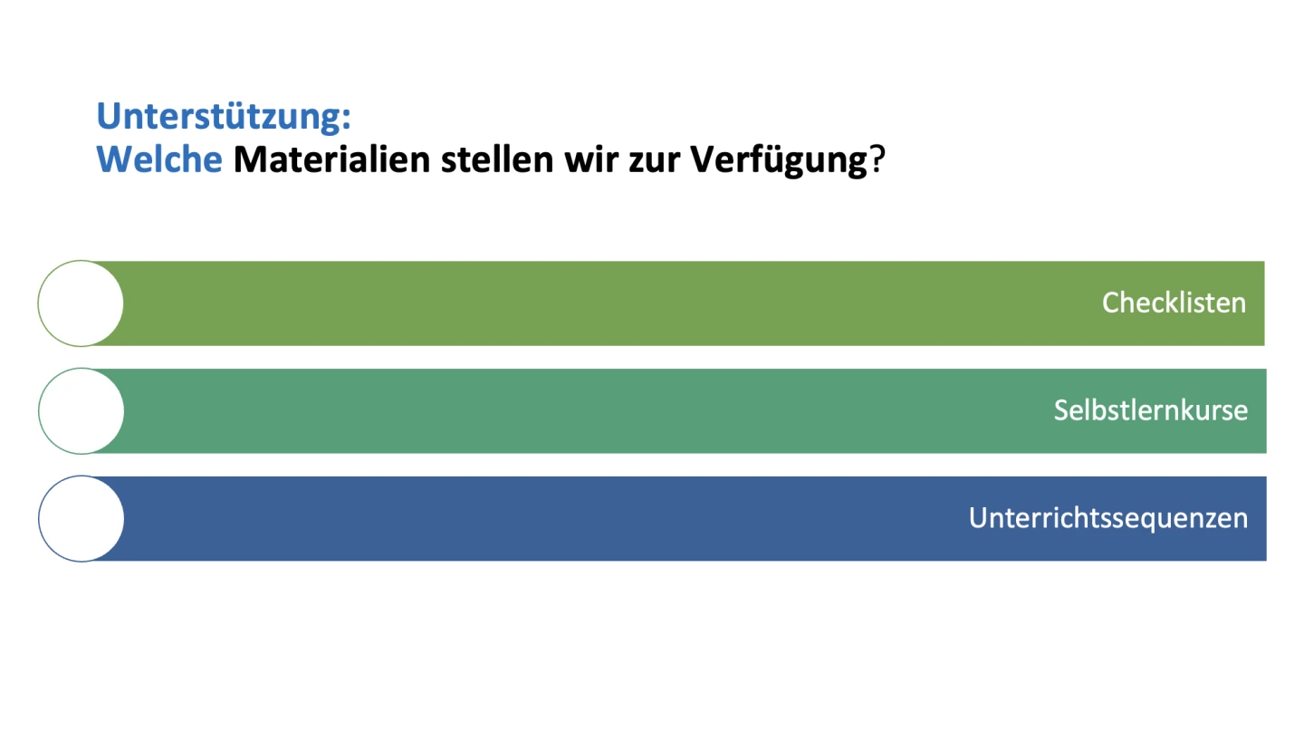 Tipp: Konkretisieren Sie dazu die in Schritt 2 definierten Inhalte, um daraus Materialien zur Begleitung der Verantwortlichen zu entwickeln, z. B. einfache Checkliste, Unterrichtssequenzen oder Selbstlernkurse. Eine Vorlage finden Sie hier. Erweitern Sie diese bei Bedarf um schulspezifische Voraussetzungen (Anwendungen, Vereinbarungen etc.).